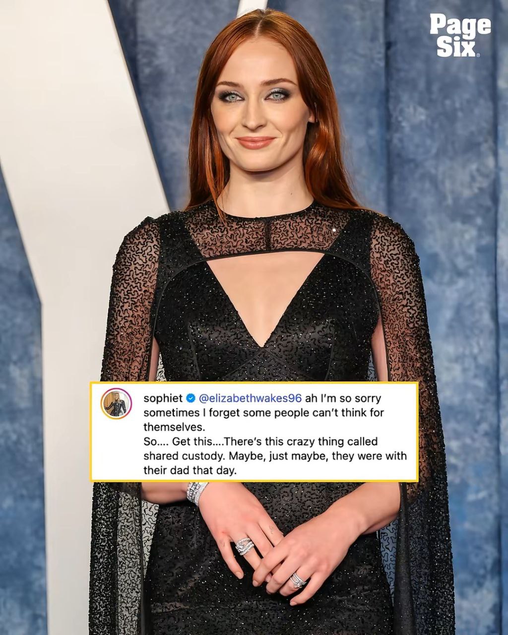 Актриса Софи Тёрнер выложила снимки с недавнего концерта группы Oasis. Один из пользователей посчитал странным, что Софи проводит время без дочерей, 4-й летней Уиллы и 2ух летней Дельфины, и написал следующее: