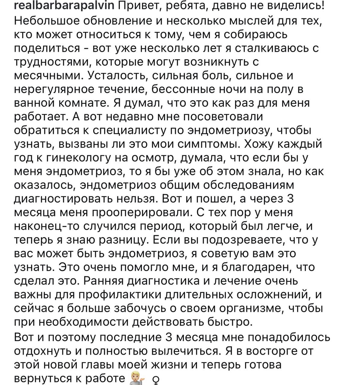 Барбара Палвин и её рассказ о перенесенной операции по поводу эндометриоза. Барбара говорит, что у неё были болезненные нерегулярные месячные, но она считала, что для неё это норма, так как на ежегодных рутинных обследованиях у гинеколога патологии не выявлялось, а оказалось, что это эндометриоз. И вот она три месяца назад сделала операцию (судя по следам на животе — это было лапароскопическое удаление очагов эндометриоза) — и почувствовала разницу