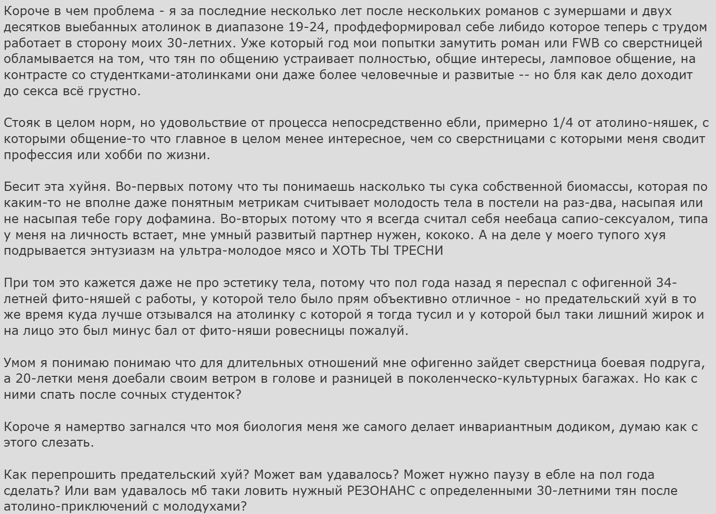 Короче да, последние пол года живу с мечтой найти мужа-кабанчика, готового меня содержать, чтобы вообще забыть про работу нахрен. Бездельничать дома не хочу, готова помогать ему по бизнесу / решать весь головняк по дому. Меня бы устроил 6/10 не сильно оскуфевший 30-летний мужик, правда я вообще хз как подступиться к фильтрации-знакомству с такими мужиками, на них ведь не написан доход и желание взять 27-летнюю тян на иждивение. Внешка у меня миловидная, но далеко не топовая, наверное по хуе-метрикам это где-то 6.5/10, наверное если убрать рабочий заеб и фигачить в зале смогу дотянуть до 7. При этом я лояльная, умею вкладываться в отношения и договороспособная. Самый ставящий палки в колёса фактор, из-за которого я решительно не могу взяться за поиски - есть ненулевой шанс что я бесплодная. А ну и еще конечно факторы, типа того что общение с додиками на СЗ невыносимо, там реально биомусор какой-то сидит подрывающий веру в мужиков.