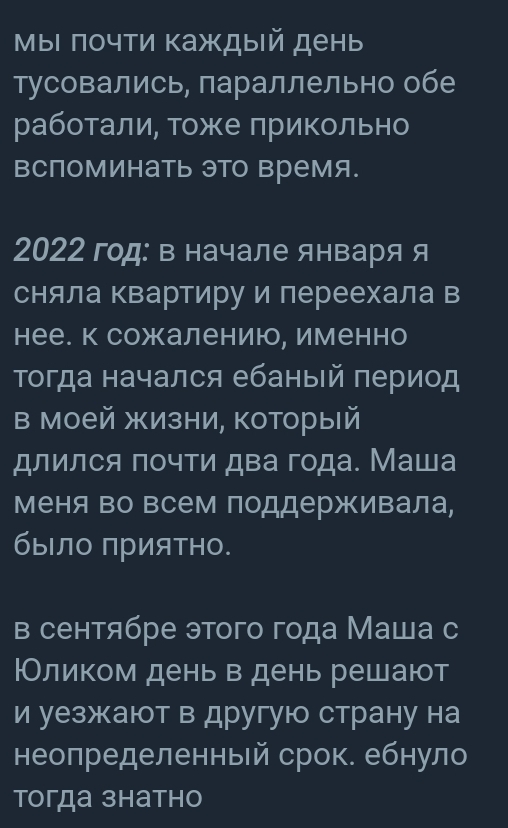 Вообще кринж пиздец на самом деле, сколько они там жидкостями обмениваются уже, год? Зачем столько усилий по переезду, если они могли тупо съехаться?