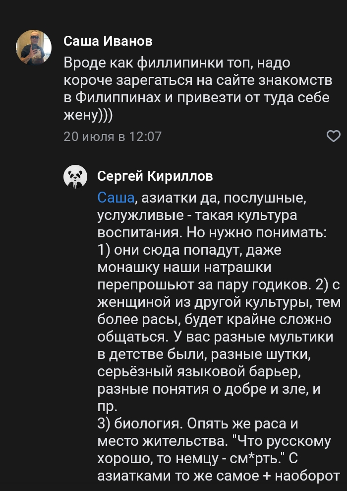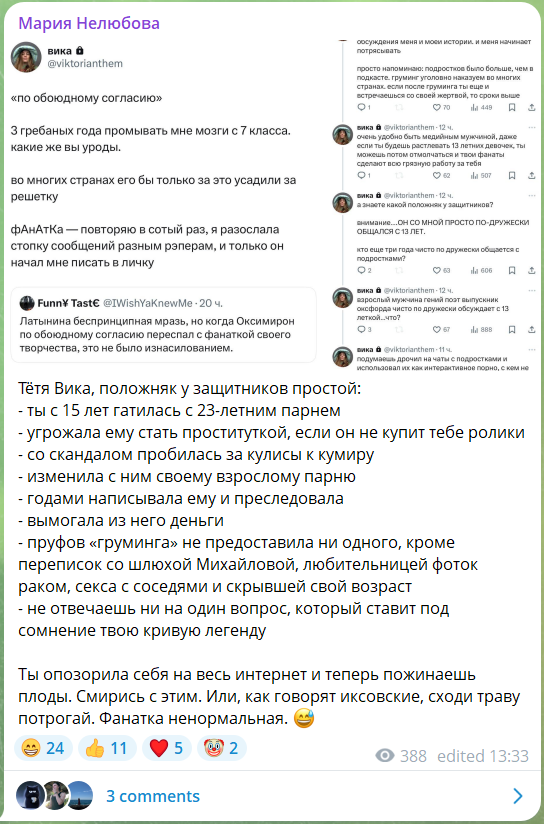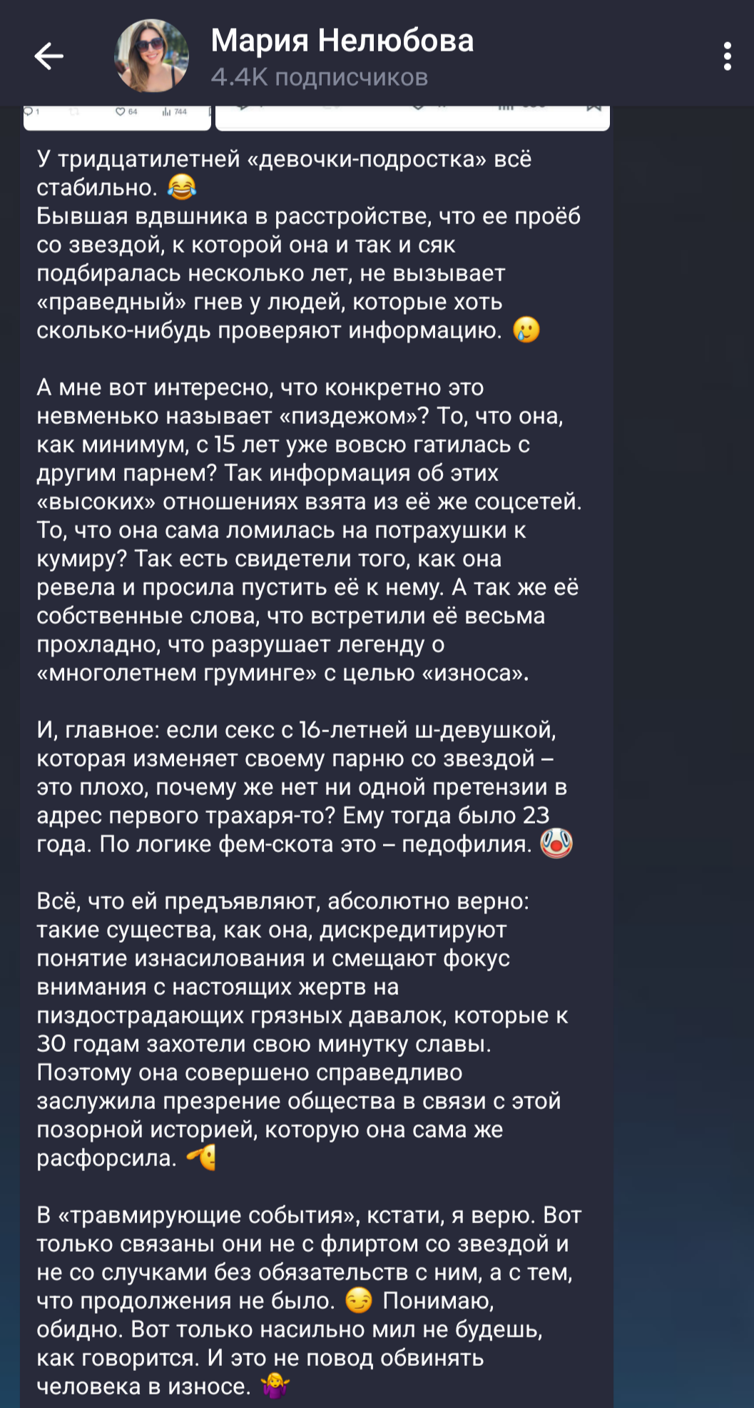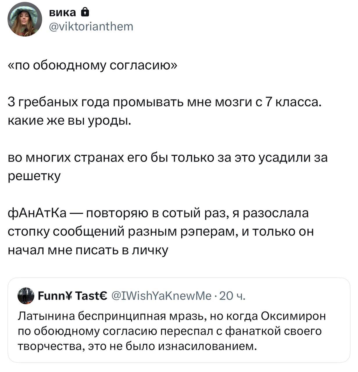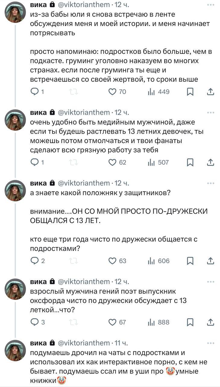>>6249156 → Так спустя время Кучак поняла, что он ей просто манипулировал. Здесь проблема не в самом сексе в 16 лет, а в растлении, которое было до возраста согласия. Он ей ссал в уши про темного бога, скидывал порнуху, давал советы и т. д. И даже после секса продолжал ее использовать вовлекая в админство страницы, подсаживая на эмоциональные качели "ты колхозница, нет ты богиня". Он давал ей мнимую надежду на отношения в будущем, чтоб под рукой всегда находилась влюбленная дурочка. Знаешь, не всем по кайфу, когда не расставляют приоритеты на берегу отношений и крадут твое время/молодость, ломают психику и пользуются.