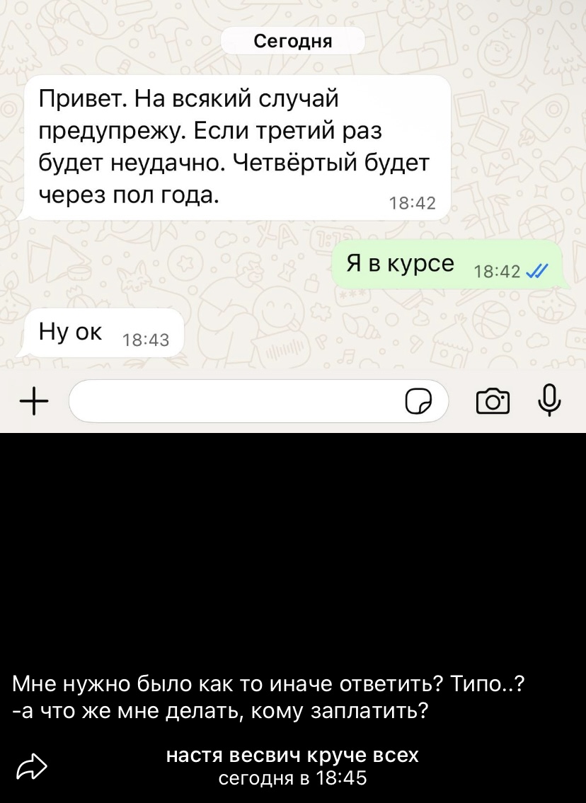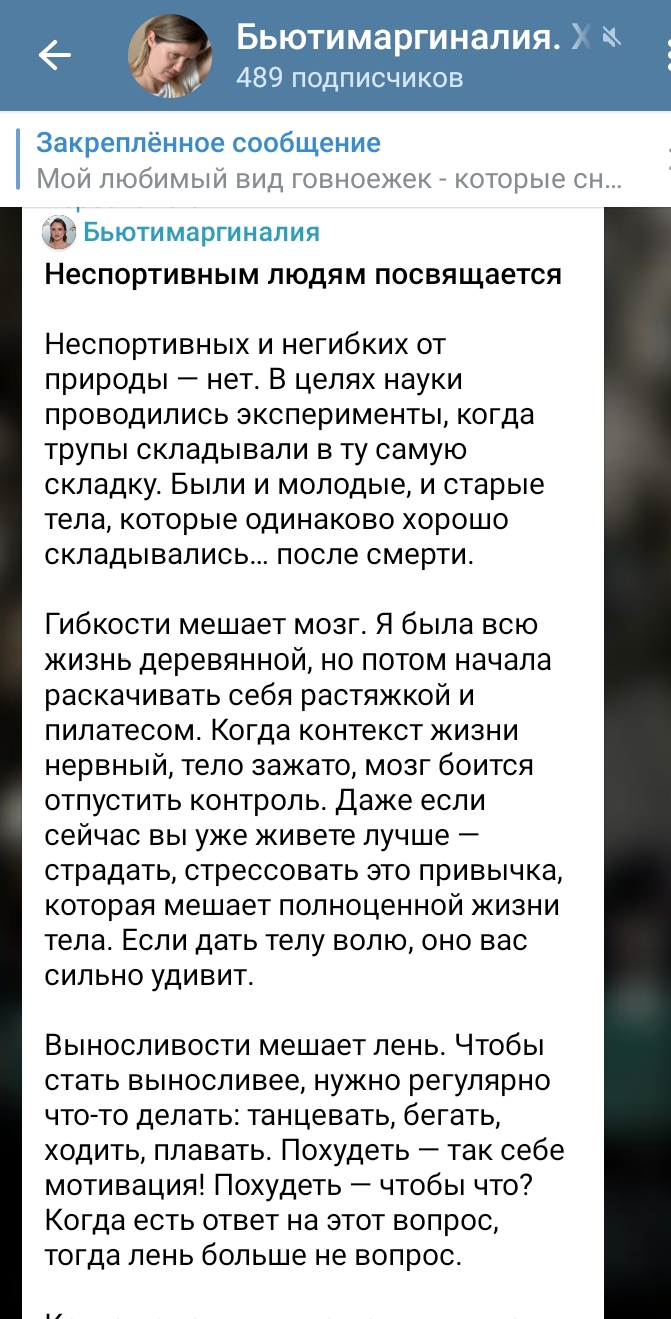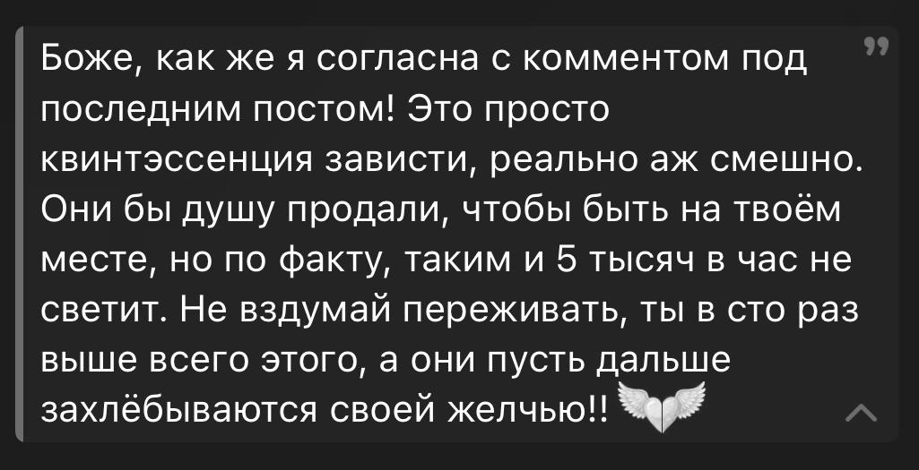 >>6249224 → >Если даже вчитаться в её текст, она как будто в первую очередь не сожалеет о потере ребенка, а больше о том, что все пошло не по плану, и о страхе показаться дефективной в глазах окружающих. Факт. Она сама когда отвечала на вопросы (в прошлых тредах скрины) подчеркивала, что важно все выполнять вовремя, у нее план и все должно быть по плану >Она так трудится над образом в соцсетях, ей так важно выглядеть во всем идеально, типа я и красавица, и стройняшка, и образованная, и работаю тружусь, и свадьба у меня самая бахатая, и чванилась всем этим. Ну тоже тут двачую. У нее даже телега называется Элиас и ее чсв. Сложно сочувствовать человеку, который так высоко себя ставит.