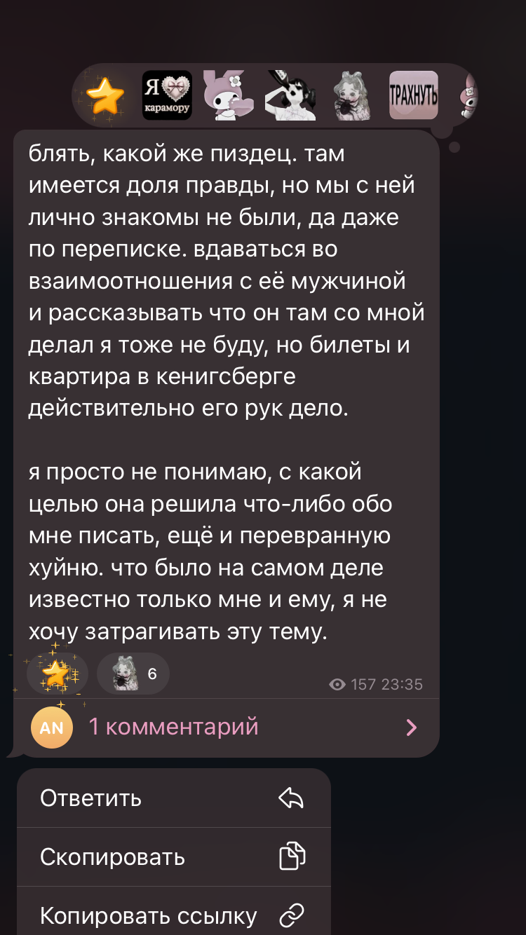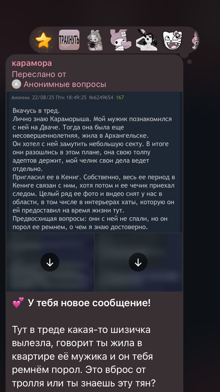 Вкачусь в тред. Лично знаю Караморыша. Мой мужик познакомился с ней на Дваче. Тогда она была еще несовершеннолетняя, жила в Архангельске. Он хотел с ней замутить небольшую секту. В итоге они разошлись в этом плане, она свою толпу адептов держит, мой челик свои дела ведет отдельно. Пригласил ее в Кениг. Собственно, весь ее период в Кениге связан с ним, хотя потом и ее чечик приехал следом. Целый ряд ее фото и видео снят у нас в области, в том числе в интерьерах хаты, которую он ей предоставил на время жизни тут. Предвосхищая вопросы: они с ней не спали, но он порол ее ремнем, о чем я знаю достоверно. Выдра-тян