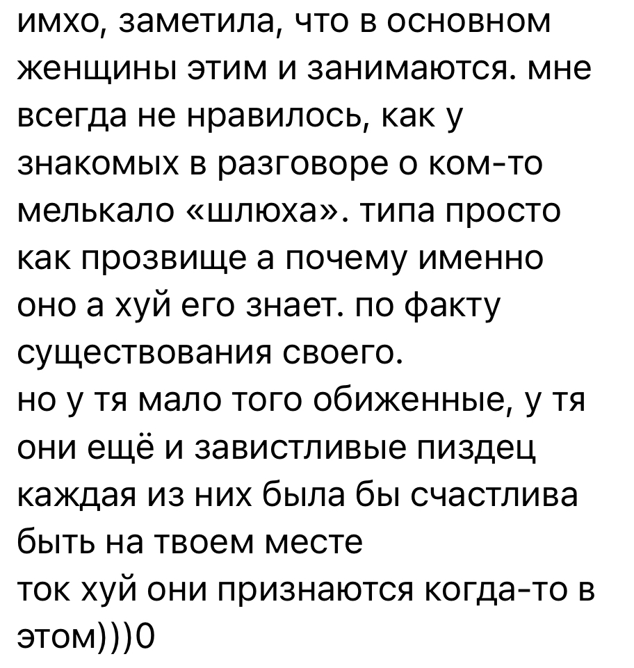 Ахахах как же у чушков горит, когда женщины ведут себя также как мужики. Ну конечно, это же только мужлу можно делить женщин на категории и пиздеть всем сразу. Это только хуемразям можно делить женщин на члюх на один раз и порядочных для семьи.