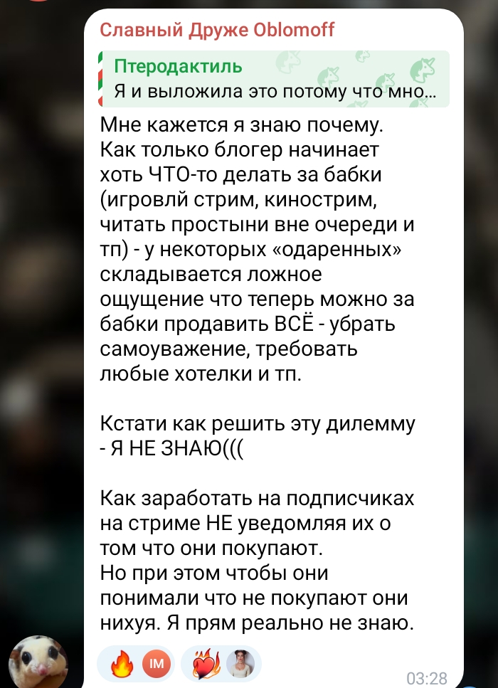 Так он и не отказался. Все понимают, что это прикол, прикол не настолько сложный, чтобы не понять этого. Ну и наверняка у кузьмы есть кредит доверия за несколько лет стриминга игр, да и он как бы из себя не строил никогда трикстера метаироничного с трёхслойным юмором, вот если бы какой-нибудь жопич так отреагировал на донат, то можно было бы поверить, что он реально не будет стримить, а так это просто очевидная шутка, очевиднейшая. На кого этот вброс рассчитан? Только на сруже обломова разве что, которому только дай повод простыню нахуярить или голосовуху на 10 минут записать