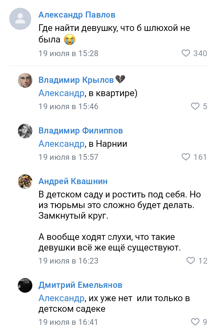>>6250446 Вот этого. Ради трёх смайликов предает женщин. Ради "я бы женился на такой, ты идеальная женщина" от суфов, которые с дивана не встанут ради нее