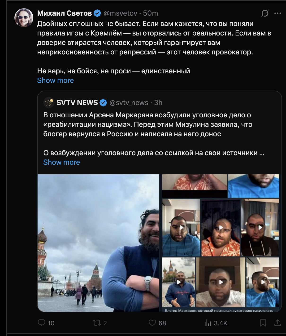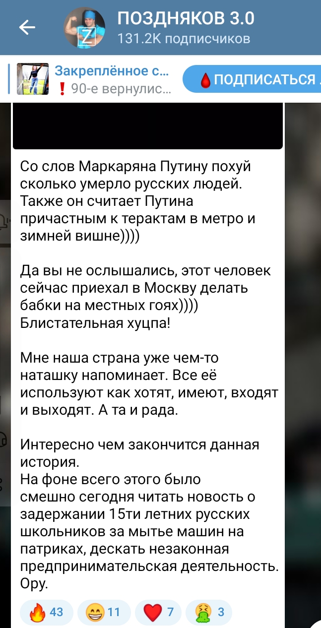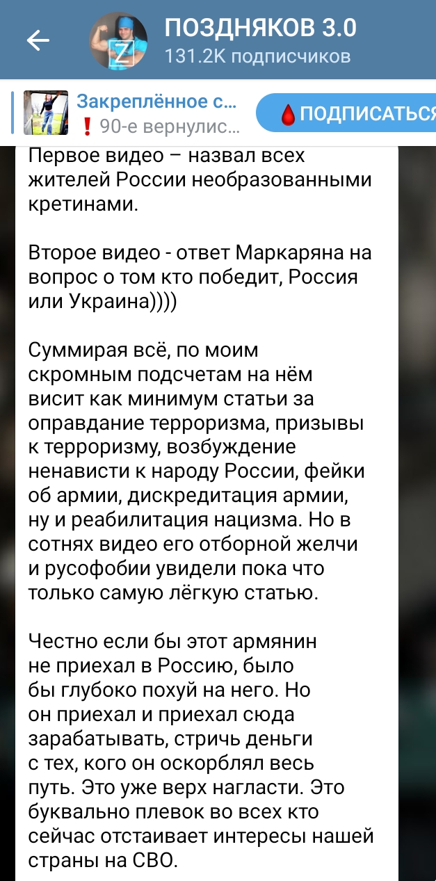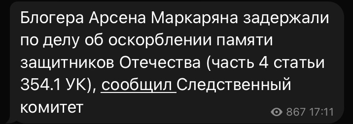 До пяти лет колонии грозит блогеру Арсену Маркаряну по уголовному делу по статье о «реабилитации нацизма», пишет SHOT Предположения о том, что блогер вернулся в Россию появились после его вчерашнего видео, в котором он на фоне Красной площади приглашал подписчиков на московский марафон. Активистам не понравилось, что блогер находится в РФ, и они потребовали его задержать. При этом, по данным «Базы», блогер пока не задержан, а опубликованные кадры могли быть сняты еще год назад.