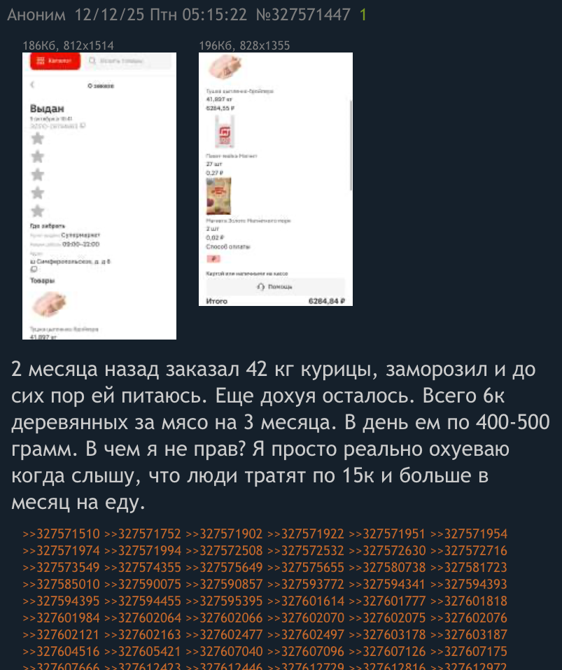 В мою морозилку влезет не более 15 кг, если утрамбовать. Видимо у него погреб, а значит, он не в квартире, а свой дом это хуета. Или он в квартире, но посреди комнаты стоит огромный гроб с 50килограммовой курицей внутри и эта курица - не спящая царевна.