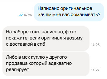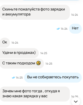 >>6370134 Мне тоже на всякие конпуторные железки писали тыщу вопросов нахуй, ответ на который есть буквально в первой ссылке гугла на сайте днса или где угодно ещё. Вообще не отвечай таким нихуя и не оправдывайся, кому реально нужно, так они максимум спросят что-то типа "здравствуйте, дефектов значимых нет, работает? всё, беру" и заказывают. А в идеале вообще заказывают молча. А вот эти уебаны с тыщей вопросов тупо у тебя время воруют и всё, и ничё не закажут потом офк, либо отменяют заказ когда ты уже в дверях с ним с упакованным стоишь. Ну или можешь дурочкой прикинуться, типа родственник попросил продать, я в этом вообще не разбираюсь, всё. Если люди такую узкоспециализированную хуйню покупают, то сами должны шарить за все характеристики что им нужно.