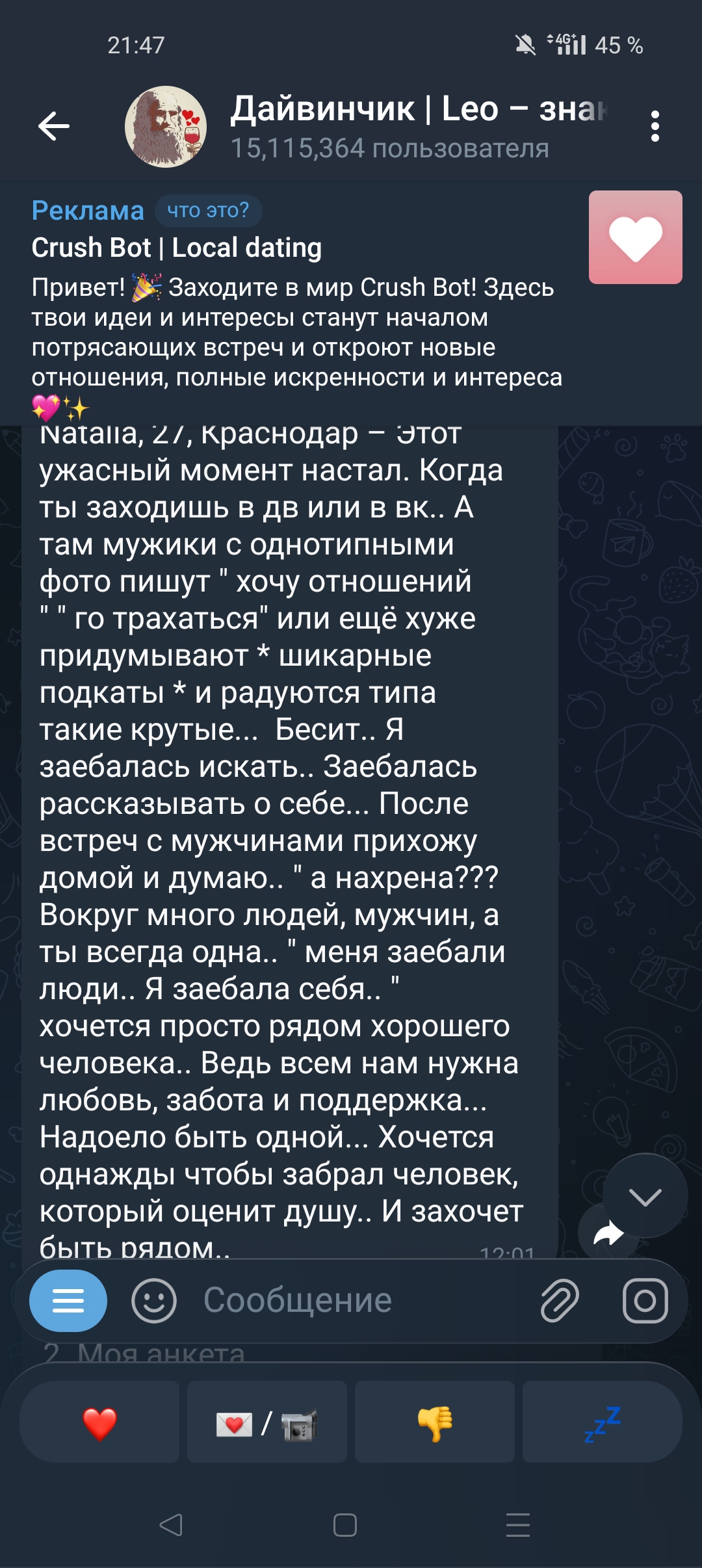 Я сидела в конфе, где один няша околочедик кудрявый высокий кидал фотки с бондик и говорил что няшился с ней, а потом кинул паблос в тг, где она ноет, как никому не нужна и фемцел...