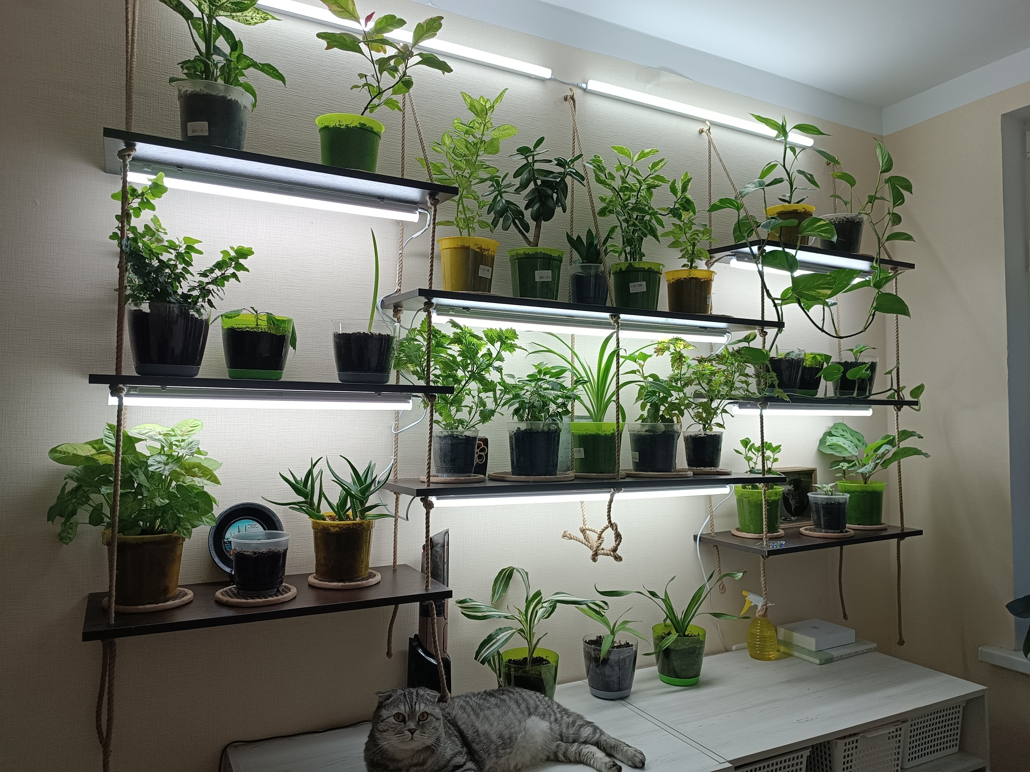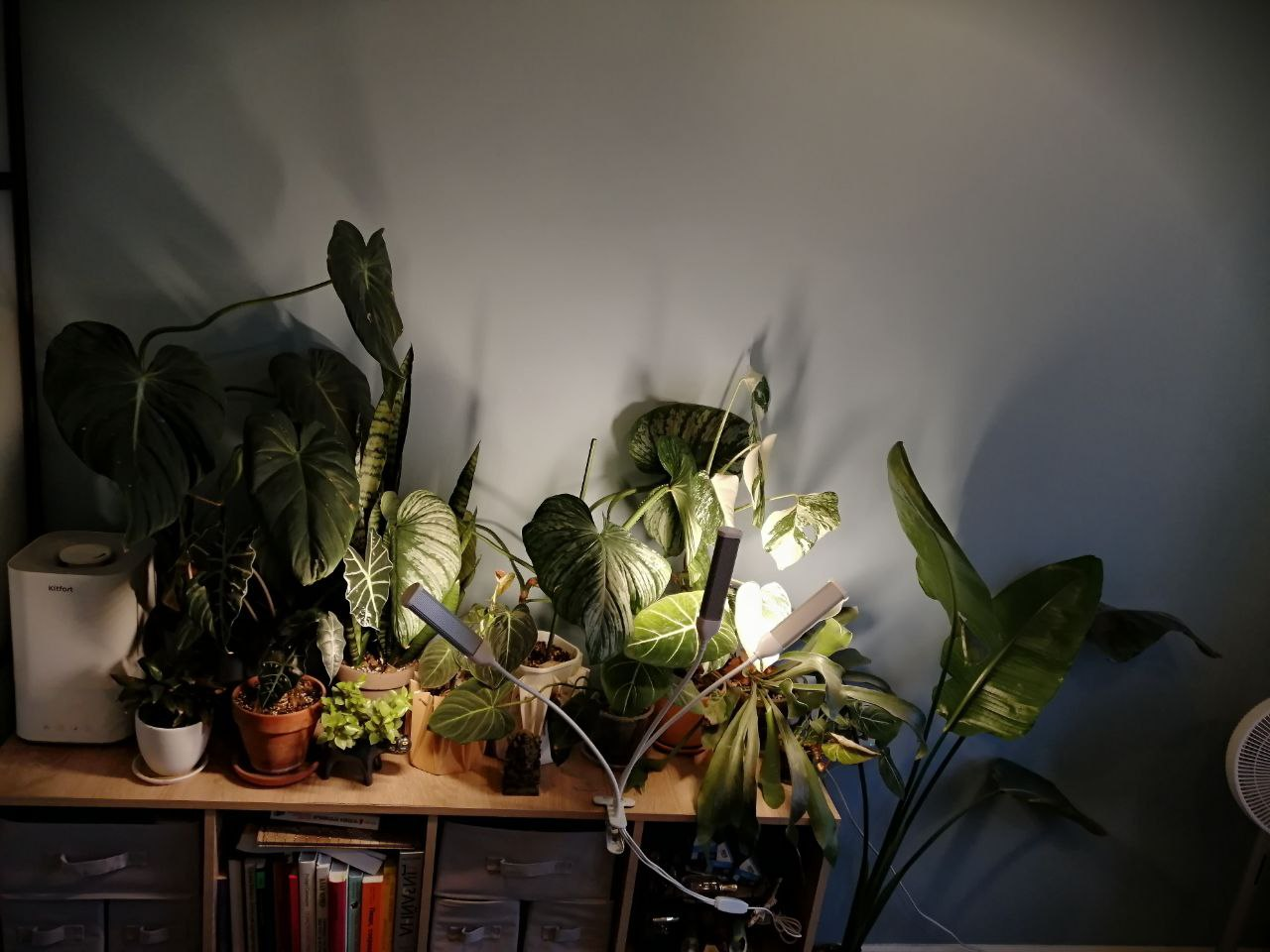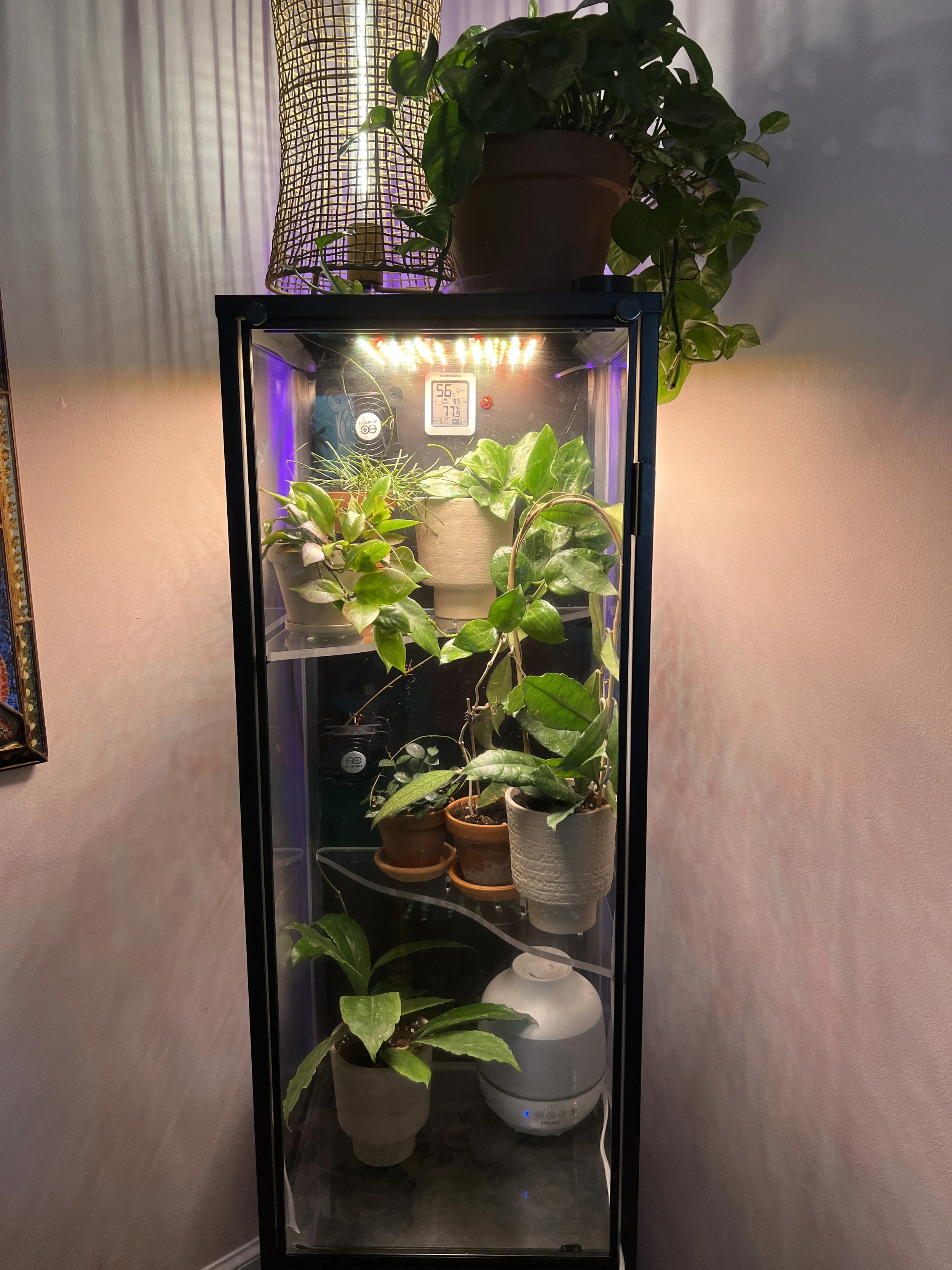 >>6251474 >с регулируемыми по высоте полками Сразу непрошеный совет - расстояние между полками должно быть повыше или регулироваться, да. У меня стеллаж типа пикрил, высокий, живет на лоджии утепленной круглый год, расстояние между полками побольше, чем на фотке. И ikea greenhouse cabinet, погуглите, кто не в теме, в инсте по тегам и на пинтересте-реддите полно - охуенная тема, и как украшение интерьера, и с практической точки зрения (пикрилы 2-3-4). У меня икейный бирюзовый шкаф металлический, а так подойдет любой - из салона стеллаж стеклянный (бывают на авито), медицинский шкаф металлический, та же икеа, в общем, на что фантазии хватит. Главное - не деревянный, сырость-с, влага-с. Внутри у меня живет в большом отвесе аква-лампа, она греющая, и диммер к ней - там выставлен автомат рассвет-закат, само всё включается, постепенно свет становитяс ярче, потом к концу дня тускнеет и выключается. Там живут тропические всякие товарищи, темпра 26-29, прыскаю им там когда не забываю, чтоб влажно было. В нижнем отсеке помельче лампы с али для растений, диодки тоже, не греющие, белые - там те, кому не надо жару, но нужен свет. Шкаф иногда проветриваю, но он и так не герметичен. На задней стене висит икейная доска с дырками, на ней крючки и полочки для подвесных горшочков. Периодически у меня там кто-нибудь вырастает, крепнет - и уезжает наружу, внутрь заезжает очередной мелкаш (люблю выращивать из мелкоты крупное). Смотрела туторы, как заморачиваются забугорные растениеводы - кто-то изолирует полностью шкаф от сквозняков, внутри увлажнитель, всякие датчики - я так не парюсь.