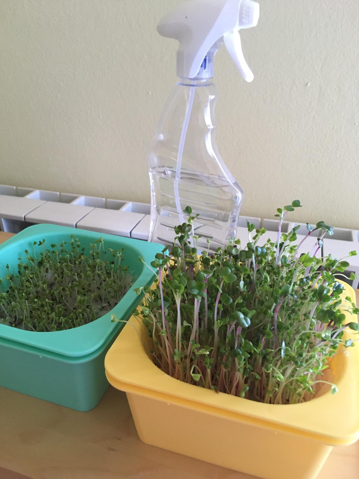 Зелень растет очень быстро, буквально за 4-5 дней их уже можно срывать. Вообще у меня набор за разной микрозелени и 6 горшков, но они так быстро растут, что все сразу и не нужны. На фото в желтом горшке называется "салатный микс", а в голубом побеги броколли.