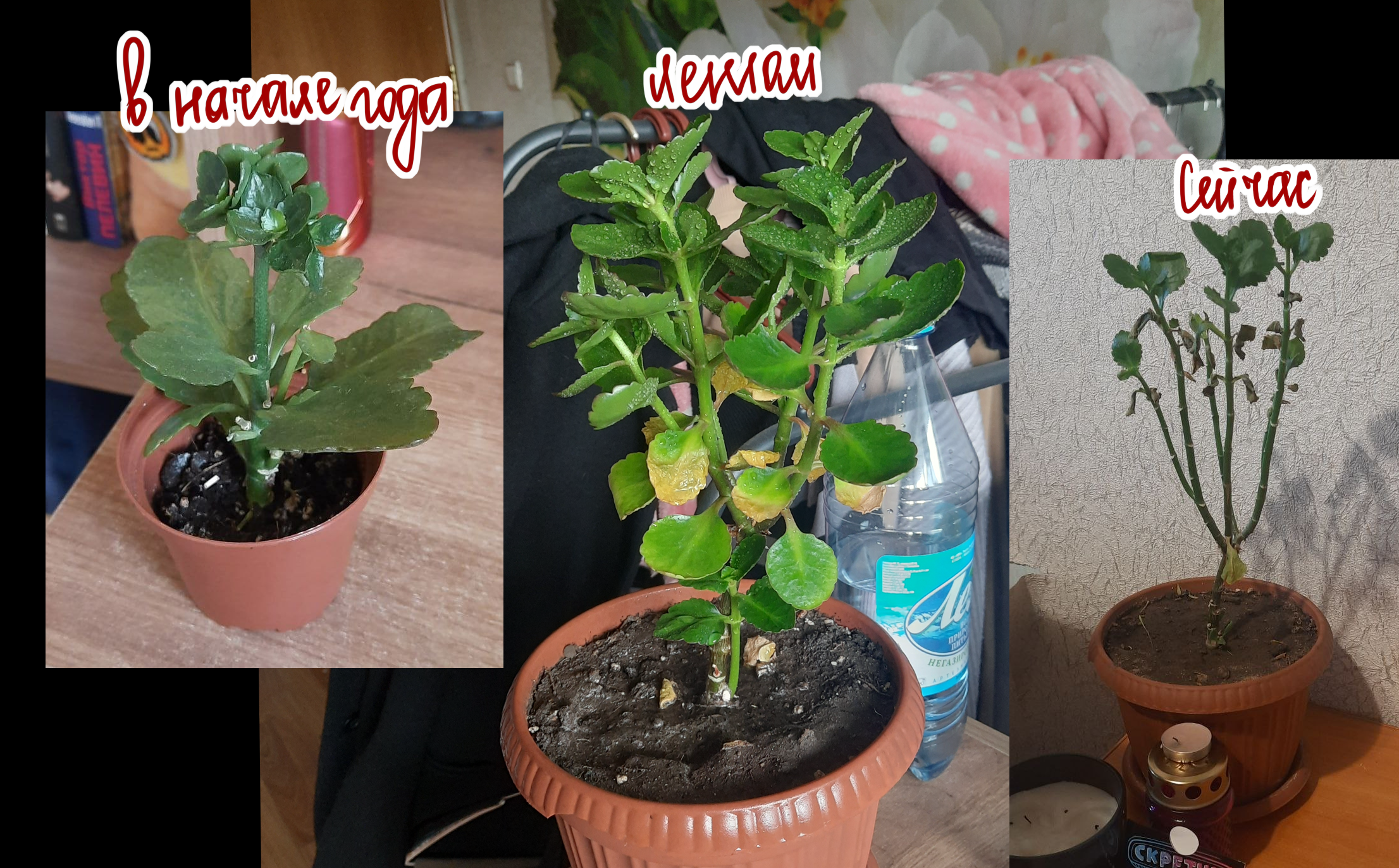 1. два кактуса, не знаю даже как их вид называется, через поиск по картинкам ничего не выдало толкового, один умер, другой вырос - наверное его красителем красным поливали, поэтому теперь шапочка белая. 2. каланхоэ, парень подарил, он вырос, летом ему наиболее хорошо было, сейчас ему очень плохо и я не знаю что с ним делать 3. купила в пятерочке, суккулент, был qr-код, но на всех горшках он не читался, просто по словам в гугле не смогла найти инструкции.