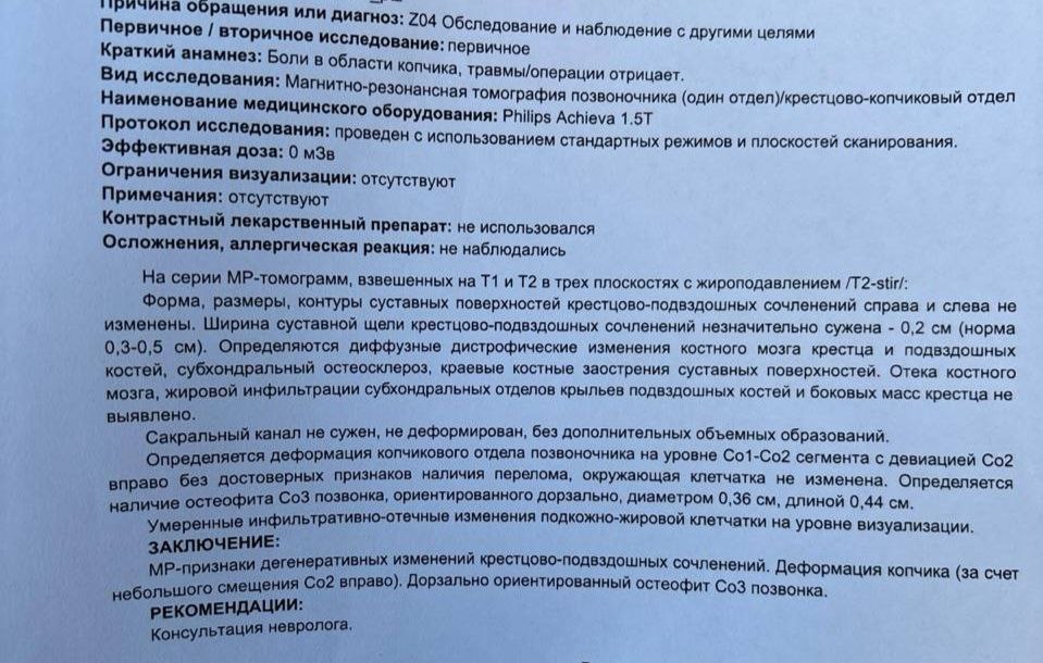 >>6089894 >>6089911 >>6097441 Сходила на платное МРТ, в мою поликлинику не дождаться Такую штуку нарисовали, специалист никакой не смотрел снимки, заключение только дали Не знаю к неврологу попробую записаться Начала с тренером в зале заниматься, сказала про копчик свой. Наверное приседать со штангой нельзя, а остальное можно