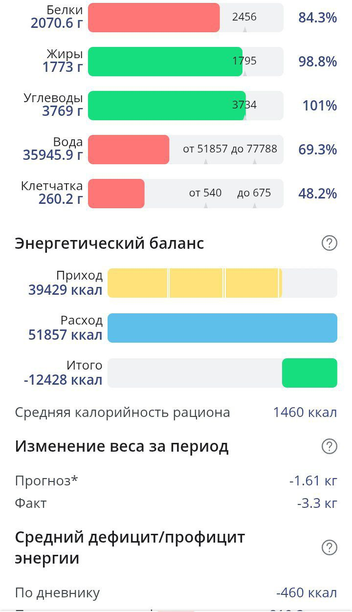 начала с апреля худеть, в этот раз упоровшись в кбжу и подсчет калорий - стараюсь наедать минимум 90-100 белка, ела сначала на 1200к, сейчас на 1600. я эти 1600 даже не всегда могу набрать, оказывается если не пить газировку с сахаром и жрать чипсы то довольно большой простор для блюд открывается. вопрос вот в чем - у меня слишком маленький или наоборот слишком большой калораж сейчас? активность у меня околонулевая, сижу дома просто, иногда стараюсь выходить на прогулку 10-13к шагов. вес почти не двигается, дай боже 2кг ушло. чувствую себя от дефицита калорий хорошо, но последние две недели грустно, что не вижу вообще никакого результата, хотя вес большой. воду пью, месяки уже кончились на днях.