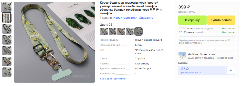 Пришел мой шнурок. Нормальный, крепление с чехлом не топорщатся. Сам по себе красивый, щелковистый. Но лента длинновата и не сделать ее короче. Могли бы чего-нибудь придумать, типа застежки на кнопку, чтоб укорачивать на время, а то низко болтается. Хотя с такой длинны удобно резко поднять и сфоткать с удобного ракурса.