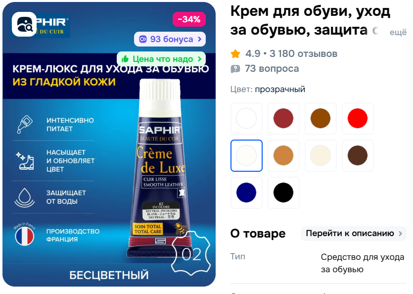 В марте 24 года купила крем для обуви Saphir, какая-то клёвая профессиональная марка. Тогда он стоил около 700 руб, но у меня много кожаной обуви, и я решила, что надо мазать её чем-то качественным. Крем хороший, бесцветный и универсальный для гладкой кожи. За год ещё не весь израсходовала, он и правда кремообразной консистенции. Только теперь стоит аж 1700, вот это я богачка...