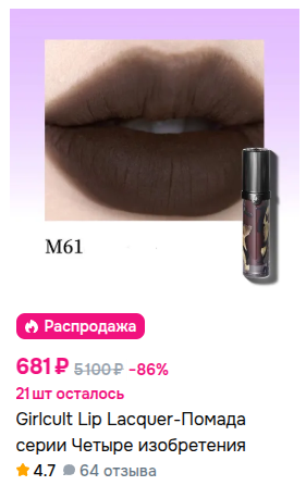 >>6242768 Ура! Рада, что тебе понравилось, от дуохрома тоже балдею, мажу его щас поверх всяких серых и холодных коричневых, оч красиво. А ты заметила, что там внутри основной коробки ещё одна коробочка с картинками из манги? Не знаю, что с ней делать, но выкинуть невозможно, лол. >>6244210 Про флортте выше >>6197378 писала, по цвету он такой светлый розовато-коричневый. На свотче получился, наверное, чуть потемнее, чем смотрится ирл. Не назвала бы его прям коричневым, слишком уходит в розовый, но всё равно достаточно близко. Истина где-то посередине между моим свотчем и магазинной пикчей. Мешаю его с чёрной помадой, чтоб получить прям коричневый. Judydoll это скорее красновато-коричневый. На магазинной пикче 100% цвет губ модели был сначала заблочен консилером или серо-бежевым карандашом, поверх своего цвета губ он такой цвет не даст. Использую его тоже поверх омбре из чёрной помады или поверх флортте, потому что он даёт хорошую плёнку, которая продлевает стойкость. Словила сегодня по скидке кстати girlcult m61, обычно он 1к+ стоил. Вот он уже прям коричневым должен быть, в отзывах пишут "как земли поела", отлично.