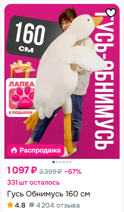 >>6257701 У меня сейчас как раз тяжелейшие муки выбора между гусем 130 см и 90 см. Достаточно ли 90 см для качественного обнимания? Не дохуя ли здоровенный 130 см? Стиралку себе за 10 минут выбрала, про гуся уже второй день мозгую...