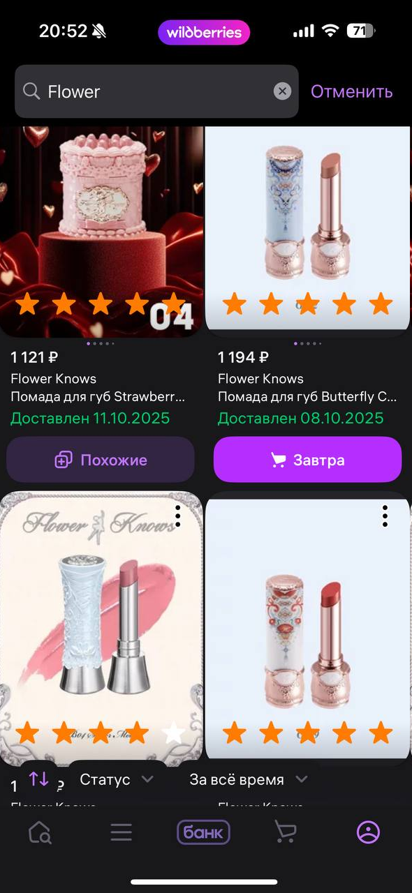 Пополнила базовый уход. Хотела взять сразу фиолетовые кроссы, но по ошибке заказала черные. Думала померить и перезаказать, но они настолько оказались охуенно удобными на мои вечно проблемные ноги, которым вечно что-то натирает и давит, что решила взять обе пары, пока они на распродаже. Стробс себе в уме пометила как первый для рассмотрения вариант. Мерила еще другие говнодавы, но оказались деревянными и не взяла.
