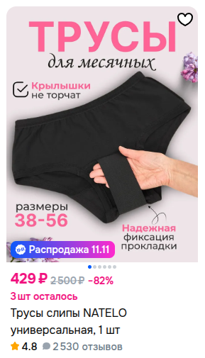 Сисы, кто юзает прокладки, от души рекомендую пикрел. Реально очень удобно, прокладка никуда не съезжает, не впивается в жопу, лежит ровно и ближе к телу, чем если клеить просто на трусы. Сами трусы тоже удобные, не пережимают нигде, но если сомневаетесь в размере, лучше взять больше, т.к. резинка верхняя немного жестковата.