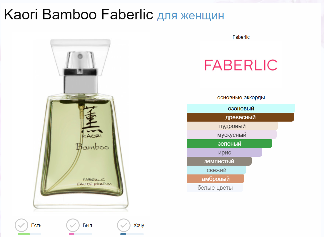 Раз речь уже зашла про каталожную парфюмерию, то может быть кто-то пользовался Kaori Bamboo от фаберлика? У меня когда-то давно были две любимые зеленые вонючки - зеленый чай Арден и большая бамбуковая бутыль из Ив Роше, но второго уже нет, а первый раньше стоил две копейки, а сейчас три или даже четыре, а я не уверена что сейчас он мне так же зайдет как раньше, а этот Каори по характеристикам вроде должен подойти под запрос, но хотелось бы здесь спросить так ли всраты фаберликовские мускусы как о них иногда говорят? Нестойкость я переживу.