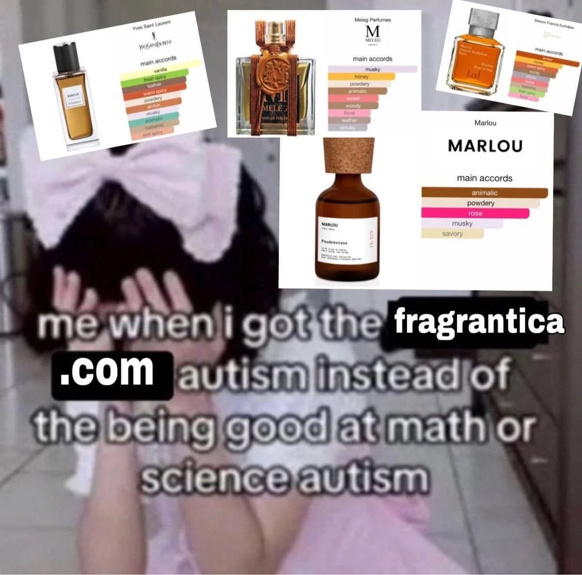 >знакомые внезапно заругали на работе однажды коллега подошла и тихонько на ушко попросила в следующий раз наносить меньше парфюма (на мне был пробник "Русалки" Брокарда, пробник заканчивался, и я и правда могла переборщить с пшиками) Мне стало неловко, я взяла спиртовой санитайзер и в туалете обработала кожу и одежду, запах стал сильно тише и быстро выветрился. А в итоге эта коллега внезапно для всех уволилась, и я всё про себя шучу "а нехуй на мои вонялки пиздеть было" (на самом деле никак не связано было, конечно, это я сама себе шутку придумала)