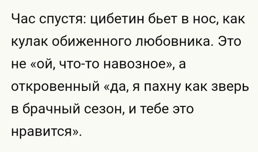 Как же тяжело найти бюджетную парфюмерию, которая хотя бы будет приятной и не удушливой, про выебоны чем-то уникальным речь даже не идет. Я что ни нюхаю, везде подвох - чаще всего начинают ебать мозг какой-нибудь ландыш или жасмин, но это может быть личная непереносимость, еще встречается сандаловая бабушка, пачулиевая земля из-под бабушки, не знаю что выдает свежепобритых дедушек, но встречается, лотос вместо медитативного созерцания речки-говнотечки обязательно выпуситит дерьмодемона, лилия кстати тоже, гнилые фруктики, кошачие лотки, ну и в худшем случае будет аромат горящего нефтеперерабатывающего завода. Накидайте нищебродских парфюмированных изделий от которых не хочется сразу отмыться что ли