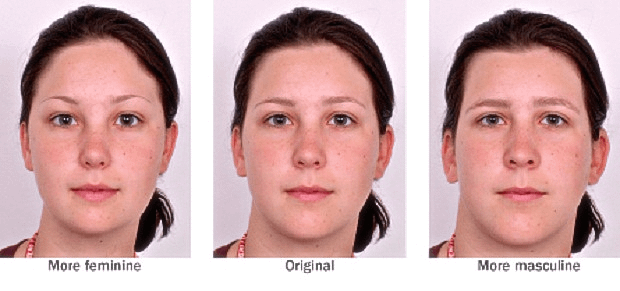 Феминное: Узкая/округлая челюсть, сглаженные надбровные дуги, высокий лоб, более округлые/мягкие черты, относительно большие глаза, тоньше кожа, изогнутые/высокие брови, меньший нос. Маскулинное: Широкая/квадратная челюсть, выраженные надбровные дуги, низкий/широкий лоб, угловатые/тяжелые черты, относительно меньшие глаза (из-за посадки), толще кожа, крупнее/выступающий нос.