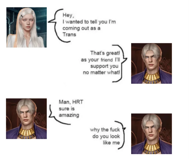 >>6200750 Тоже его взяла, во-первых остальные парни унылые, во-вторых ветка с антагонистом это прям глоток свежего воздуха. Подозреваю что гг контора все-же подгонит как-нибудь бессмертие по-братски, но чем закончится ветка реально любопытно, только ради нее и читаю. И раз уж разговор за КР, есть тут сеймы кто с гг СНР ловит литералли ми вайбы? Подозреваю что тут из читавших таких 9 из 10 если не 10 из 10 лол. Такого легкого селфинсерта у меня еще ни разу в новеллах не было, я давно привыкла что типикал ГГиня это добрая дружелюбная лохушка которая всем нравится. Здорово что новые истории в приложениях отходят от этого шаблона, вот бы еще давали самой поиграть за злодейку без принудительного отмывания в добрую лохушку. Эх, Вискарик мой Вискарик... А ее отношения с Каином это "два ебаната по которым психушка плачет нашли друг друга", прям мед.