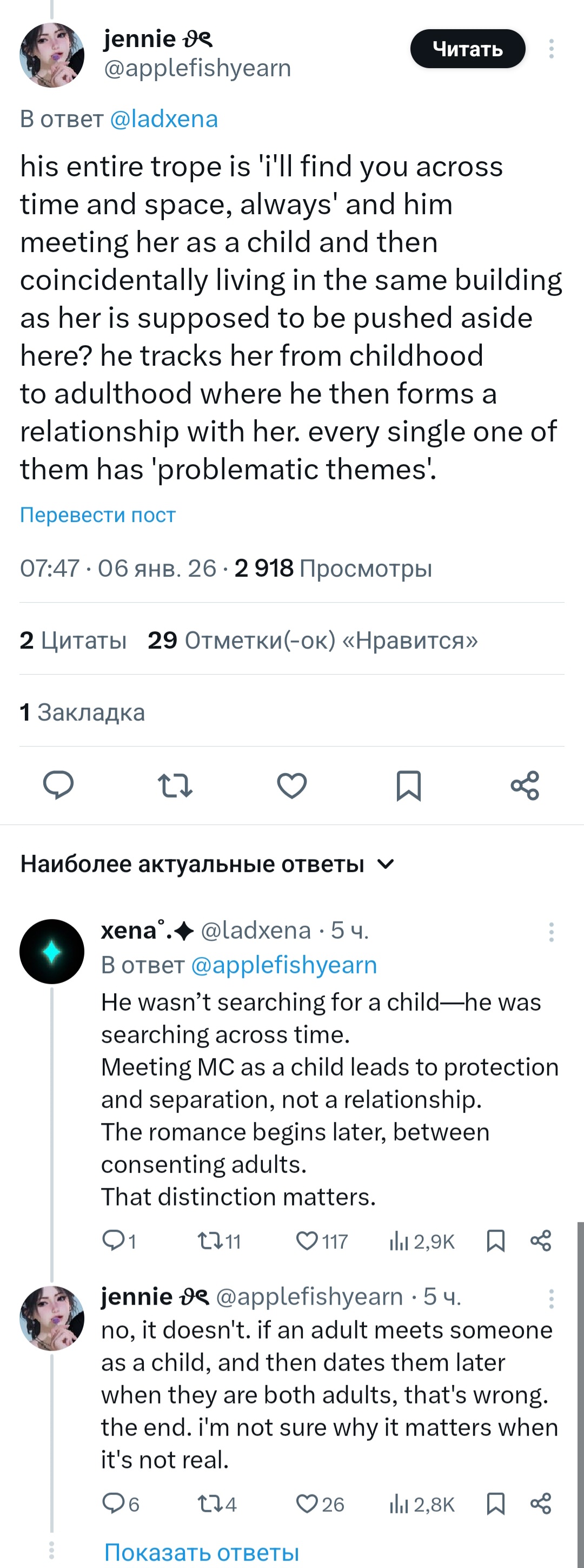 Лучшая защита это нападение. Там еще зейну предъявили за то, что он доктор и в позиции власти пхахаха. Да калеб может и кайфует с того, что она его младшая сестра, но зейн доктор) И новый положняк: Если взрослый перс видел будущего мелкого партнера до совершеннолетия, значит грумил