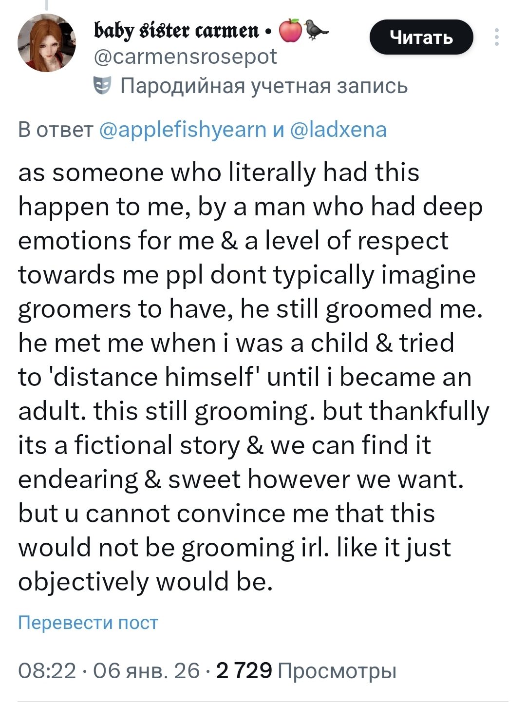 Видела так же как жертва инцеста ирл писала, что вам нужно охладить траханье и начать различать реальность и фикшн