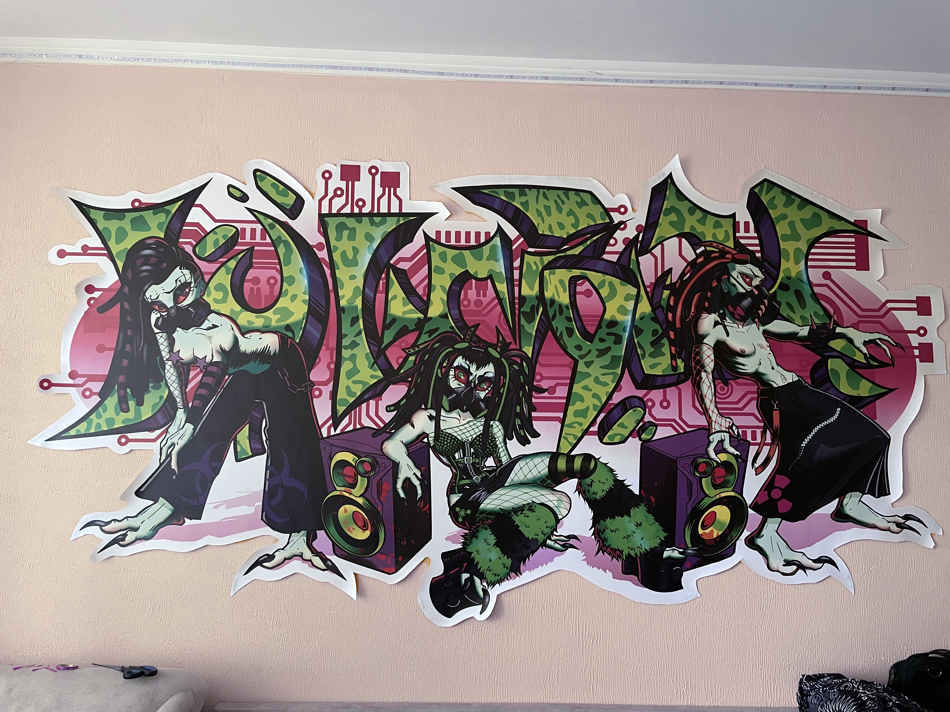 Недавно пиздец занастольгировала по хате бывшего в которой я жила, я там три раза бомбила стенки граффити. Было пиздец лампово и стильно. Но к сожалению сейчас я живу на съеме, и за два года в этой квартире мне впервые пришла идея сделать граффити в дидже, а потом тупо широкоформатный баннер напечатать, обрезать и повесить на стену.