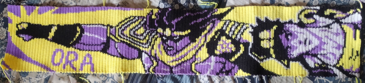 >>6215918 Около 2 м в длину и около 20 см в ширину, там дальше уже Дио и За Варудо будут изображены. Только я не учла, когда рисовала схему, что столбики как бы вытянутые, потому что у меня нет особо опыта в вязании, и поэтому сам рисунок тоже растянутый чуть-чуть получается. Пока просто набиваю руку
