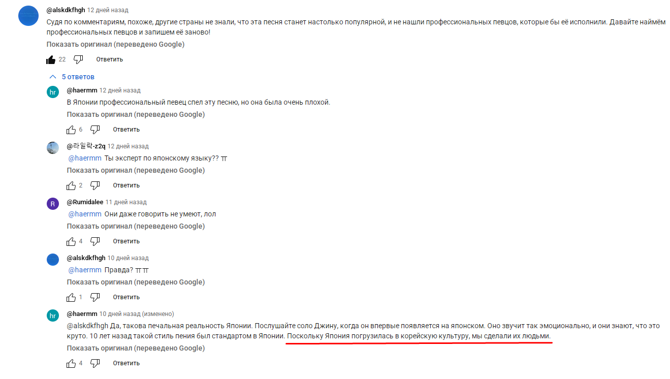 Корейцы в комментариях засрали всех, себя объявили богами поп-музыки, а что они написали про японцев вообще обосраться можно. Скоро увидим комментарии, что Японское море надо переименовывать в Корейское, ведь корейцы сами лично его выкопали.