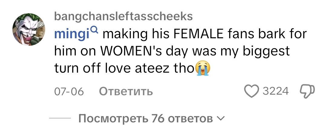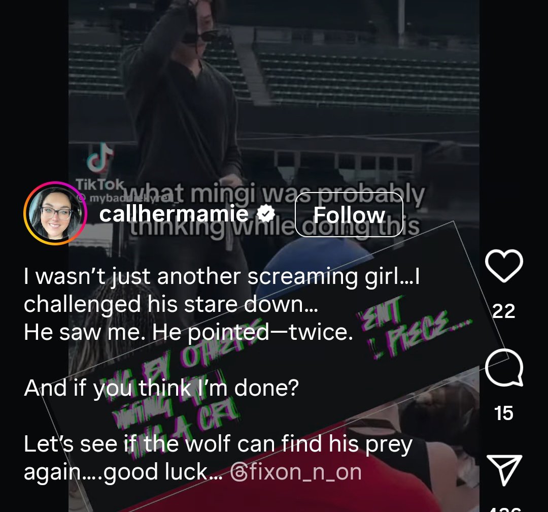 На концерте Ateez в США была фанатка, которая решила, что у неё случился "особый момент" с Минги, она рассказала об этом в соц. сетях и стала делулу. Все уже шутят её фразочками про "волк нашёл свою добычу") писали, что она вообще замужем.