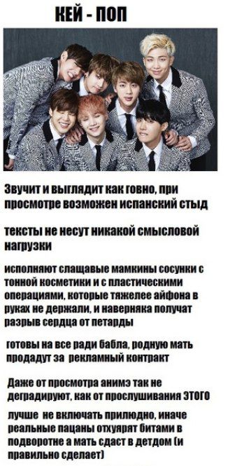 Не ради срача, мне просто интересно, откуда такая популярность БТС среди тянок? Могу еще бабулек понять, они их как внучат воспринимают. На внешку так себе (Намджун вообще всратан, у Чимина странная внешность), до сих пор какой-то образ твинков, даже армия не помогла превратиться в мужиков. Чонгук с детским лицом и пирсингами пубертатника у них главный вокалист, посмотрела как он вживую поет и танцует, ну очень средненько, те же Джексон Ван, DPR IAN, Джей Парк и др. намного лучше выступают и взаимодействуют с аудиторией.
