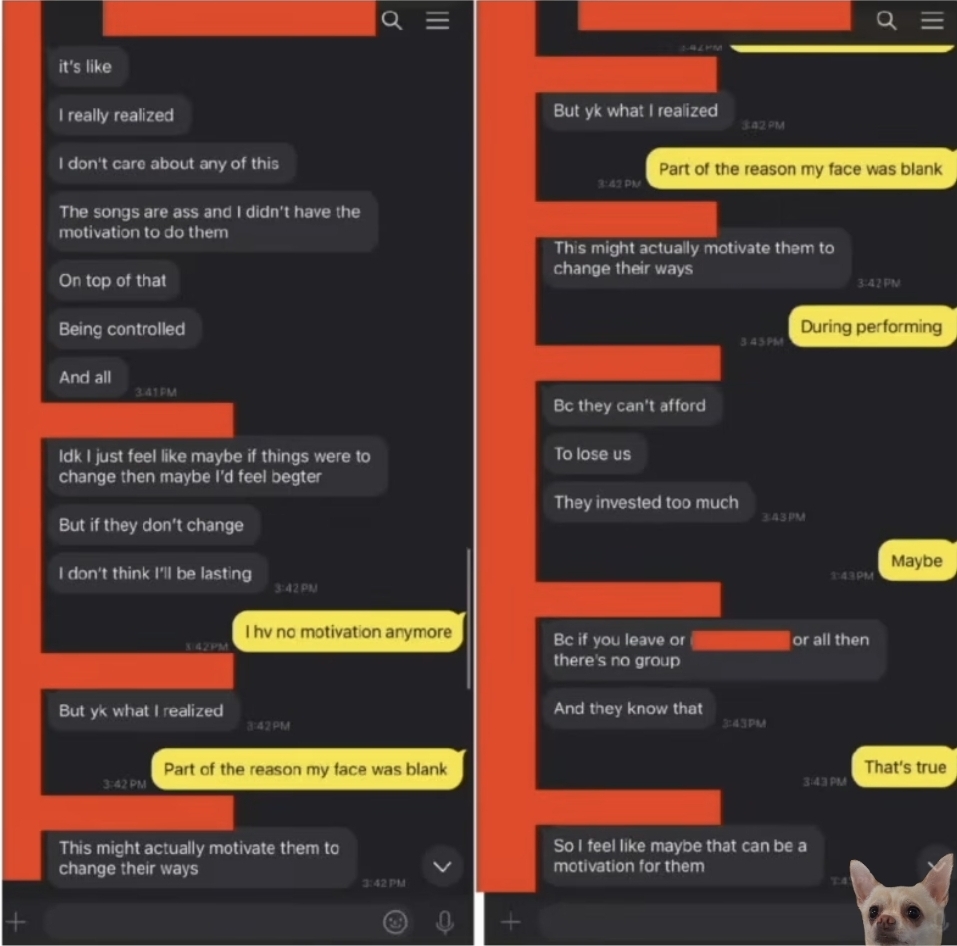 И еще про Кейли. Мне интересно с кем эти переписки songs are ass лол, они были показаны в суде. Это кто-то все еще внутри группы или это Кейли, которая уже ушла, кстати без суда. То ли они ее отпустили без выплаты долга в 500к долларов и она подписала nda, то ли ее родители погасили долг. Мне кажется Кейли спасло то, что она была не первой и группа уже разваливается + если она была той, кто ркн, то суд был бы ужасной перспективой для jype. Что бы там не происходило, это стало бы достоянием общественности