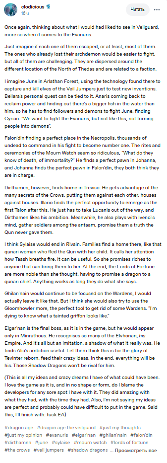 >>6266659 А я всё же начала перепроходить вейлгард, хотя в прошлый раз за два месяца еле дотошнила. Тоже по драгонаге скучаю, надо же было им так обосраться, это пиздец...