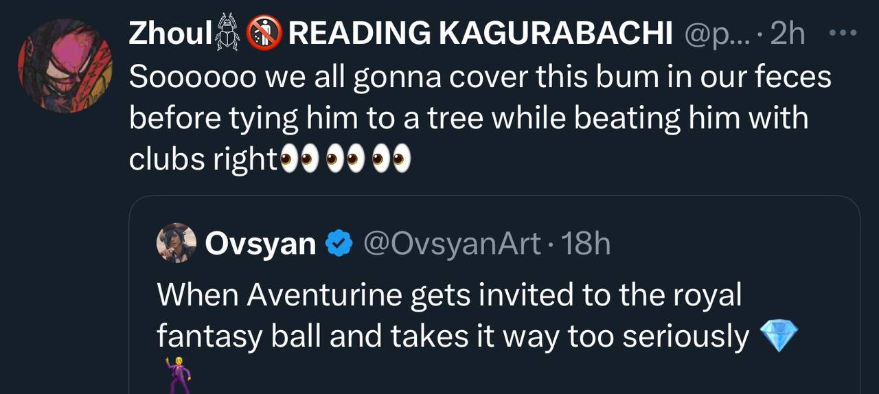2. Их слишком дохуя и с каждым ответом от криейтора - будет только больше. 🫠 Даже если вы спорите/дискутируете изначально только с кем-то одним и пытаетесь адекватно высказать свою позицию: ОЧЕНЬ СКОРО какой-то из реплаев/комментов будет репостнут в комьюнити, где сидят много агрессивных борцов за справедливость с кучей свободного времени - и вот вам уже надо спорить с сотней человек одновременно 🤡