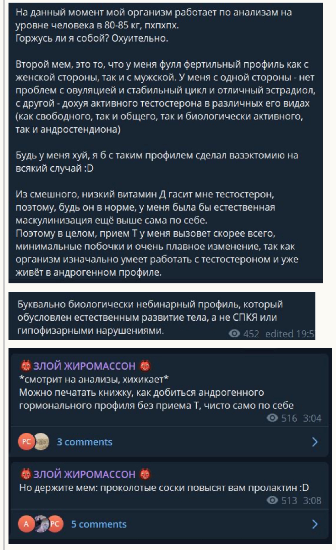 Замужняя 31лвл женщина натурально сошла с ума и считает себя геем-доминатором (что тянется ещё со времён дайри). Она уже весит за 100кг и в каком-то диком копиуме, что по всем показателям здоровья она мужчина. Психуятор поставил аспергера и трансгендерность хотя она по кд выискивает у себя ментальный ушиб всей бабки и доёбывает врачей.