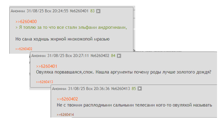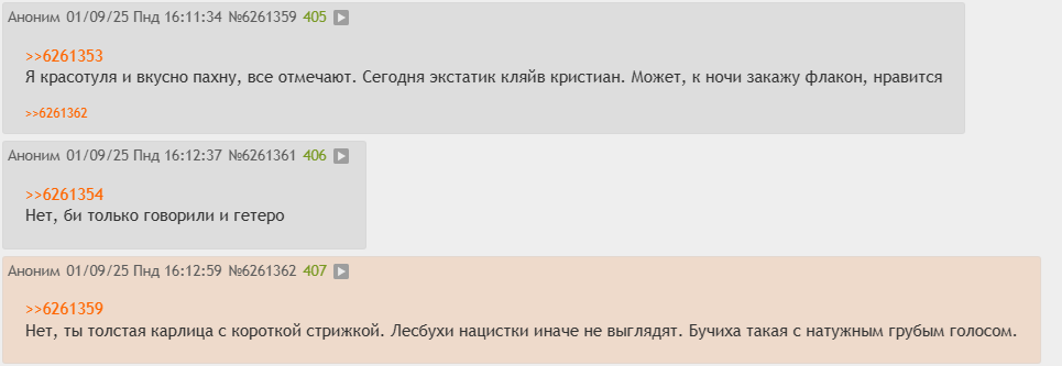 >>6261775 В первом посте я не вижу ничего мизогинного, да, грубовато, но нацилесбуха выражалась о женщинах гораздо грубее, что-то ты ей ничего не сказала. Да и в целом здесь с фтм не няшкаются. Остальные два поста - ответочка в том же ключе нацилесбухе, в чем проблема?