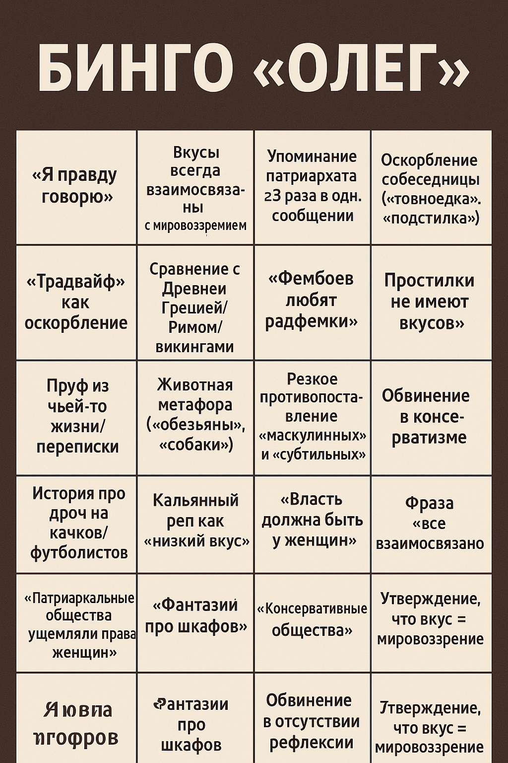 Сейчас наткнулась в тиктоке на большое обсуждение, где девушки признавались, что вообще не возбуждаются от мужчин, и не понимают, а четакова. И вот я думаю, насколько же скуфолахта проникла во все, что девушки даже не могут отрефлексировать то, что в них убиты природные механизмы. Просто представьте жить в мире, где вместо еды говно, и не понимать что тут что-то не то. И ведь они первые, кто будут коупить, как в мужчине не важна внешность. Пик чтобы отбить плохие мысли.