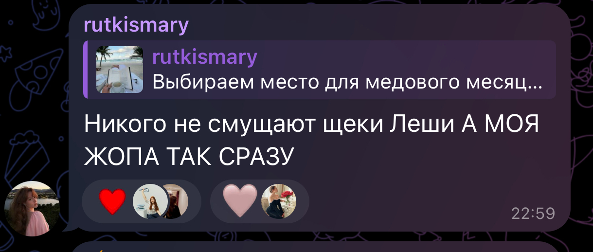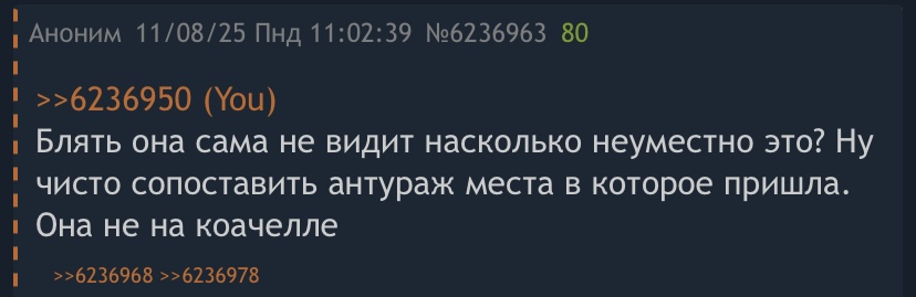 Занимательная арифметика: какие охваты нам нужны, чтобы у каждой тян была подружка, которая узнает в Хуйладе то самое хуйло? Чтобы у каждой проститутки или эскортницы он был в чс. Чтобы на Землеройку с презрением и сочувствием смотрели ее обожаемые подружки, на которых она молится и примазаться к которым так стремилась, вроде Маши Руткис.