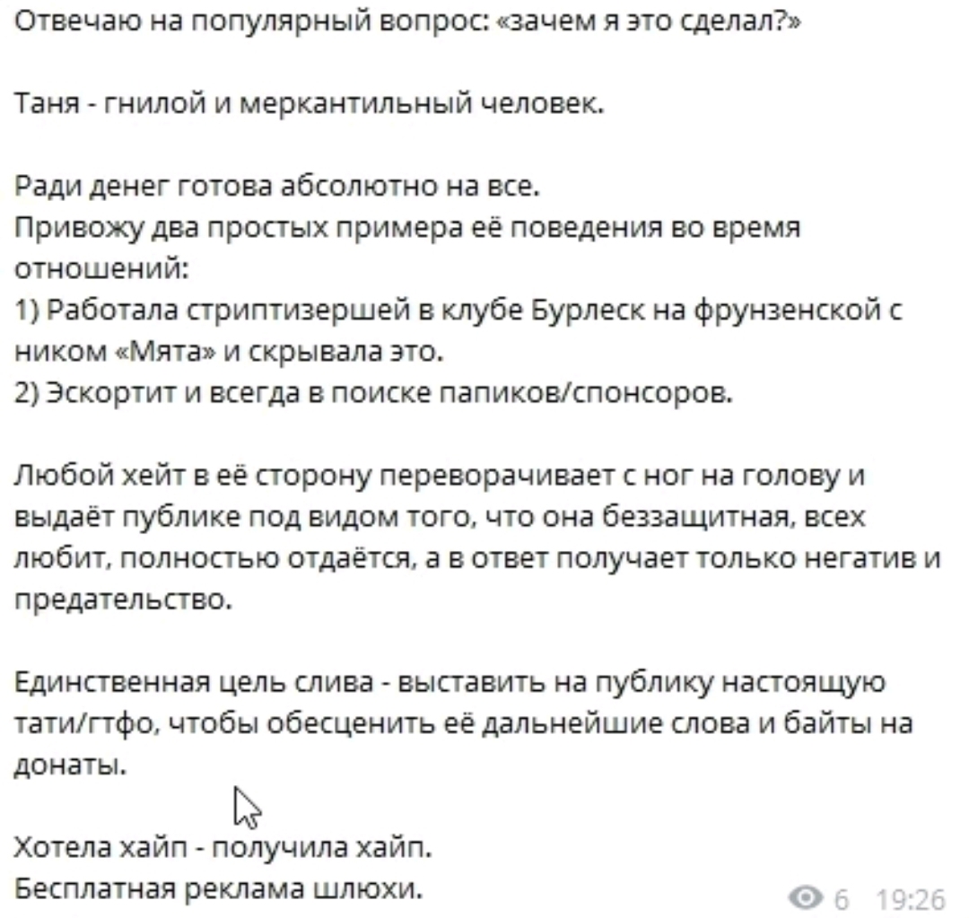 Я посмотрела видео "разоблачение" и я ВАХУИ, что хуйло видит там причину для хейта этой Тани, но их не смущает, что Хуйлад сливал медицинские справки и заплатил какому-то быдлу, чтобы ее отпиздили. Да, там это говорится прямо. В клубе она работала хостесс, но они натягивают сову на глобус и говорят ЕТА НИТАКОЙ КЛУБ ТУДА НЕ ВОЗЬМУТ РАБОТАТЬ ХОСТЕС СНАЧАЛА НАДО ПОРАБОТАТЬ СТРИПТИЗЕРШЕЙ. Пруф — потому что ему в лс какой-то чел, который это сливал ТАКСКОЗАЛ. Чиво блять? А вы в курсе, что было в справке написано, когда итт чушло писало АНА ЕГО ЗАРАЗИЛА ВЕНЕРИЧКОЙ? Герпес там, блять.