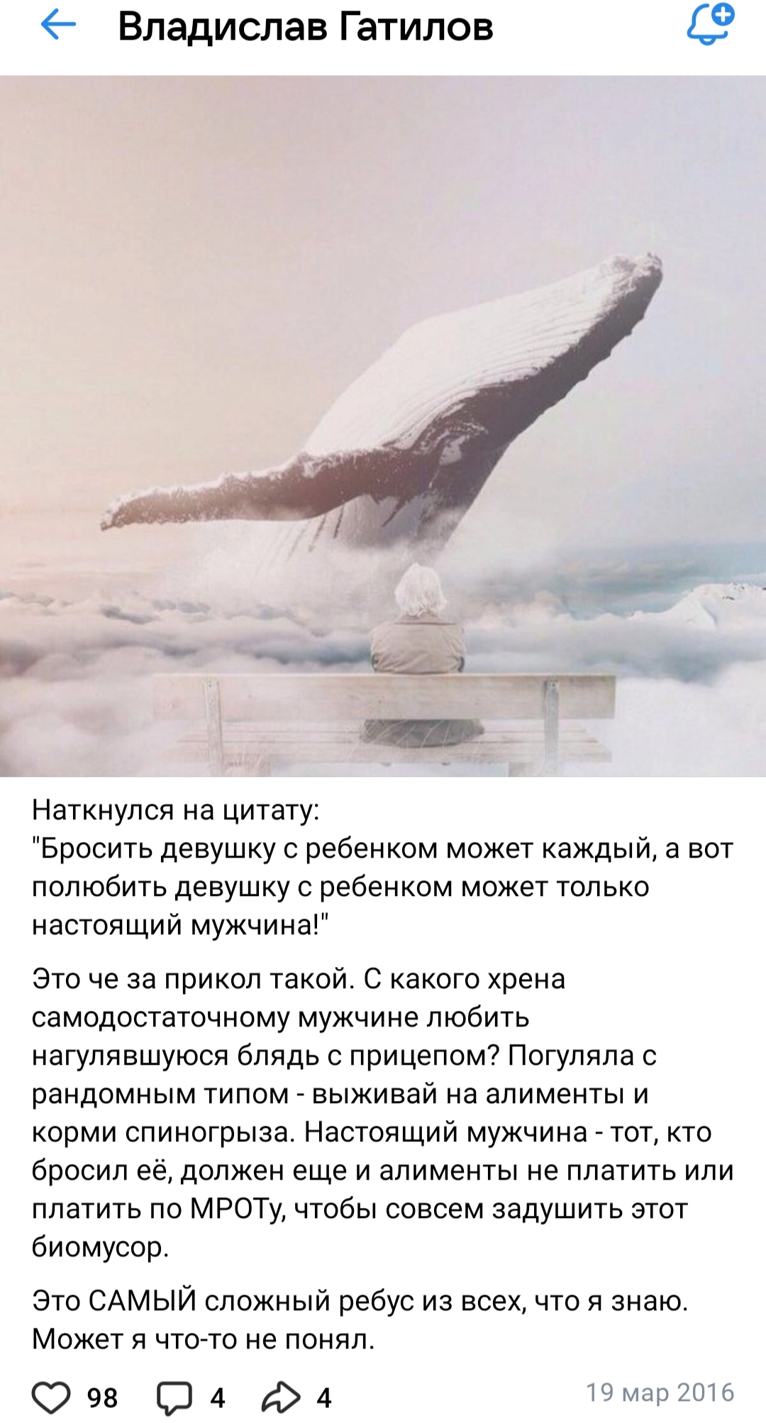 >>6237098 Досмотрела. Все видео - это визг чухана, которого обломали с писечкой. Как же это в очередной раз иллюстрирует психологию хуев. Поддерживать тян они будут только с планом, что им потом дадут. А как только тати к Владу вернулась и стало понятно, что чухану не обломится, у чухана подгорело и она сразу стала шлендрой, а не подругой)) Чета вспомнила еще тот всратый сериал про ребенка инsела, он тож писал тян после слива, думая что она теперь на дне и даст ему. Ну и еще становится понятно, что Владик наркоман. Надо форсить это тоже