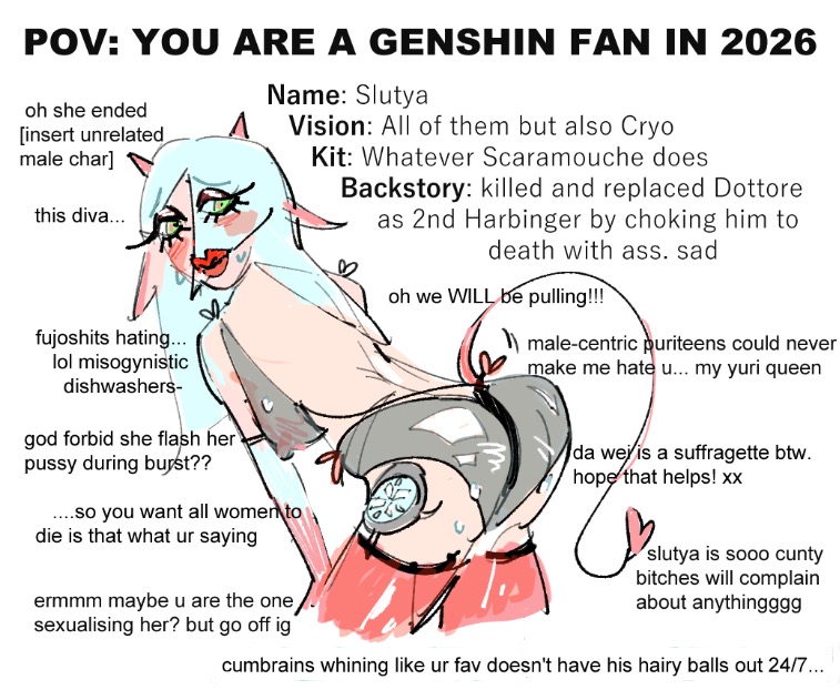 В Инфинити Никки показали трейлер нового сезона, где появился новый мужик (наконец-то). На реддите все счастливы, а на китайских форумах опять стоит вой, что их юри икону Никки шкварят чертовой хуемразью и вообще Никки игра про крепкую женскую дружбу, а кто хочет мужчин, тот пусть валит в дипспейс. Если почекать профили этих людей, то можно обнаружить, что там пореаловые фотки, на которых явно не женщины, эротические дакимакуры, арты как две девы с гигантскими грудями трутся друг о друга, видео, как они трут трусы на фигурках Кафки или Аяки (кого узнала) пальцами, кое-кто даже облизывал. Эдиты с призывом не подпускать западных женщин к гачам, чтобы они не развратили персонажей (втф, может, перевод был неправильный). Много чего еще. К концу скроллинга у меня дергался глаз.