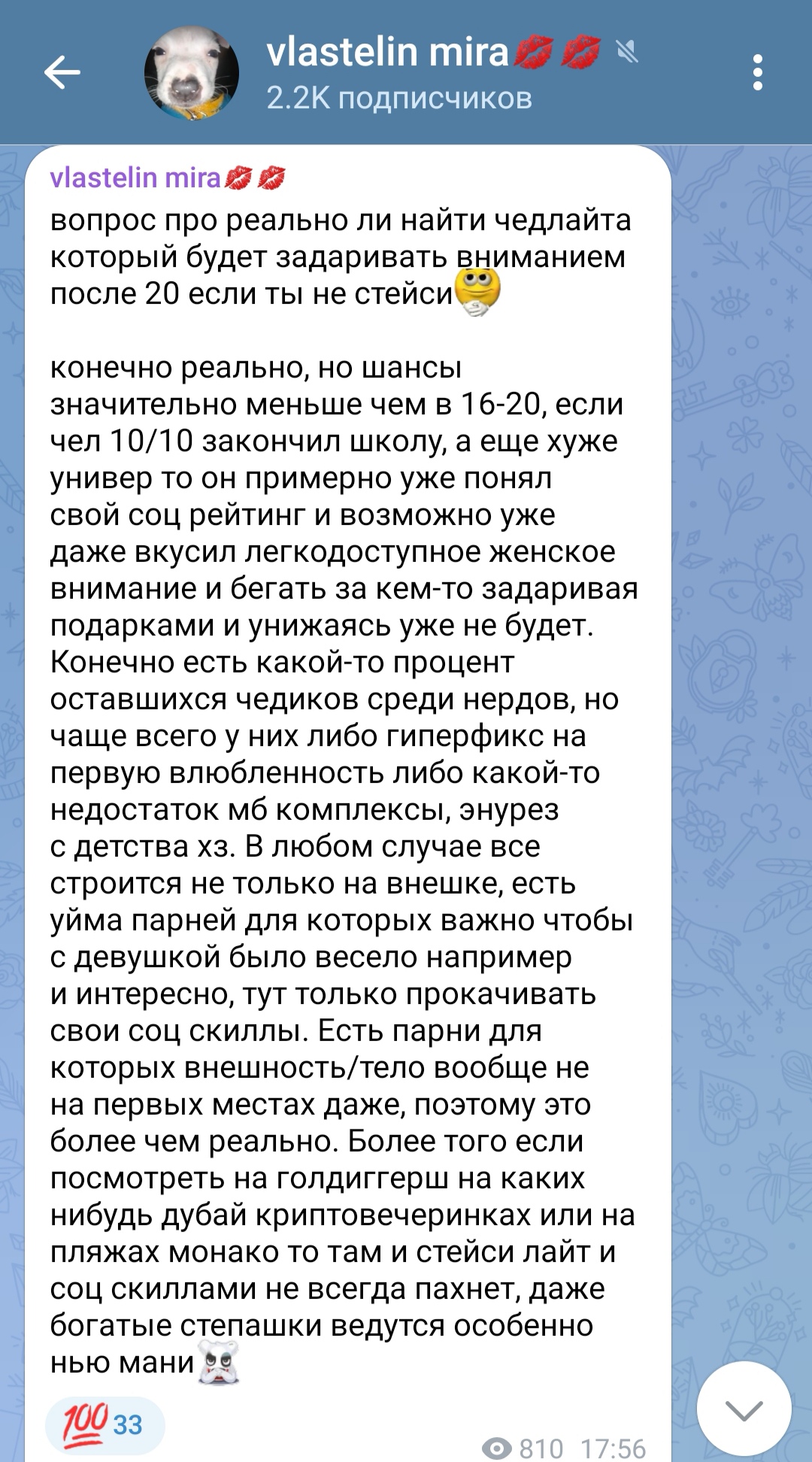Если кому интересны еще делулу пациенты, советую канал жены бывшего популярного тиктокера Худси Бишопа. Регулярно какую-то хуету постит про отношения, есть фиксация на чедах и стейси, своей внешке, иногда пишет про чакры и прочую эзотерику, раньше продавала свои фото дрочерам, теперь скрывает это и строит из себя традвайф. Инфантильный и очень закомплексованный пациент. Худси ей изменил, пару лет была драма про то, что она не может его простить, а потом он начал возить ее по япониям и бали и она закоупила, что проработала все с психологом и теперь они нормально общаются. То, что они сношаются, отрицает, якобы они теперь реально друзья, а не как раньше, когда скрывали свои отношения во время пика его популярности. Сама мира среднетян, которая в свое время залутала куна красивеее нее, а теперь поняла, что лучше никого не найдет, ведь такие аутисты с хорошей внешкой, готовые ее обеспечивать встречаются редко.
