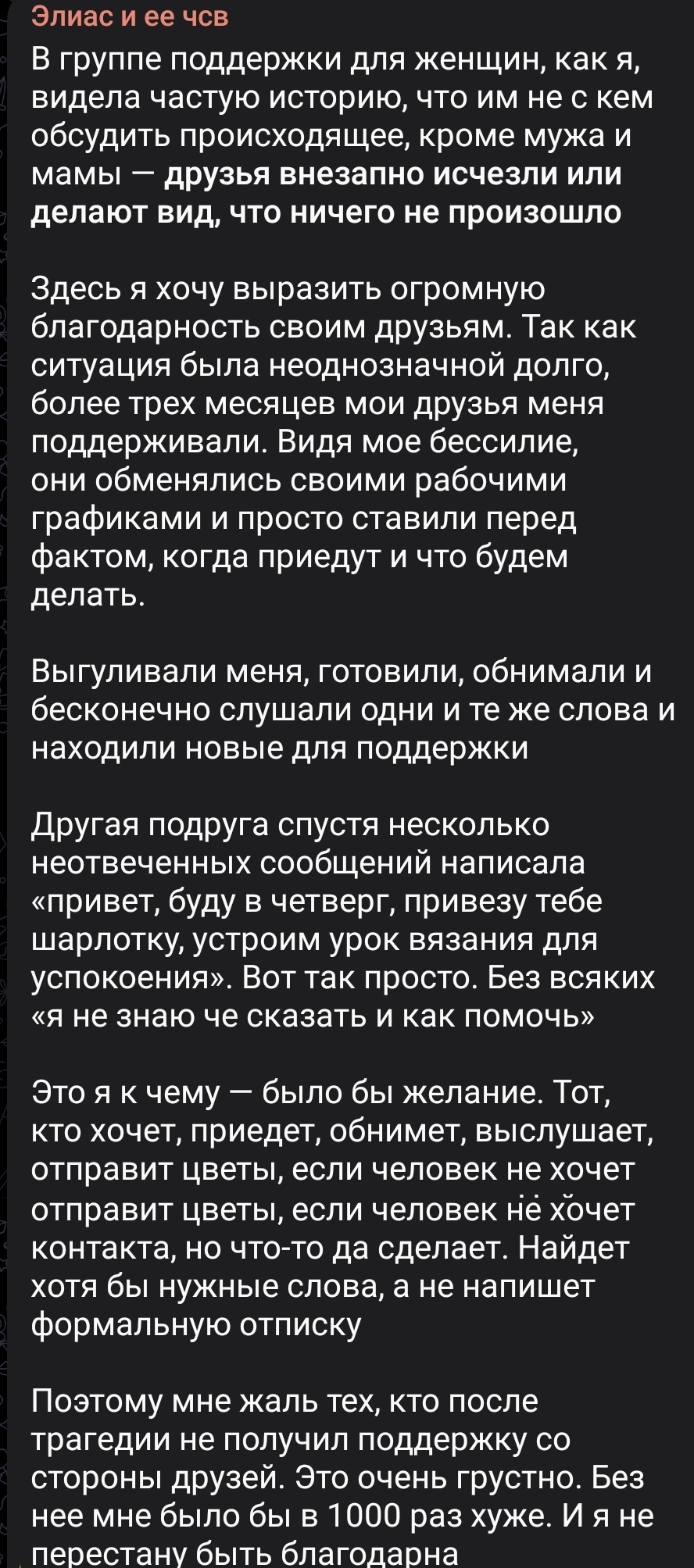 >>6259745 Пишет-то она нормальные вещи, просто не учитывает, что она сама по себе говна палата и никто лицемерить в такой момент не будет. Ей слова поддержки - она что-нибудь токсичное выдаст (а раньше позвонить не мог? что мне от твоих слов?) или вообще эмоционально повиснет. Я считаю, что в такой момент должны поддерживать только те, кто на это готов. Сочувствую чисто по-человечески, всякое бывает. Бабушка потеряла второго ребенка, он умер через несколько месяцев после рождения, в то время таких детей (что-то с желчным пузырем) не могли вылечить. Это отложило отпечаток и на мою маму - она очень боялась заводить второго, делилась, что смерть брата перенесла очень тяжело, очень ждала его. И вот как-то ... Ну это все хуевые ситуации, как ни крути.