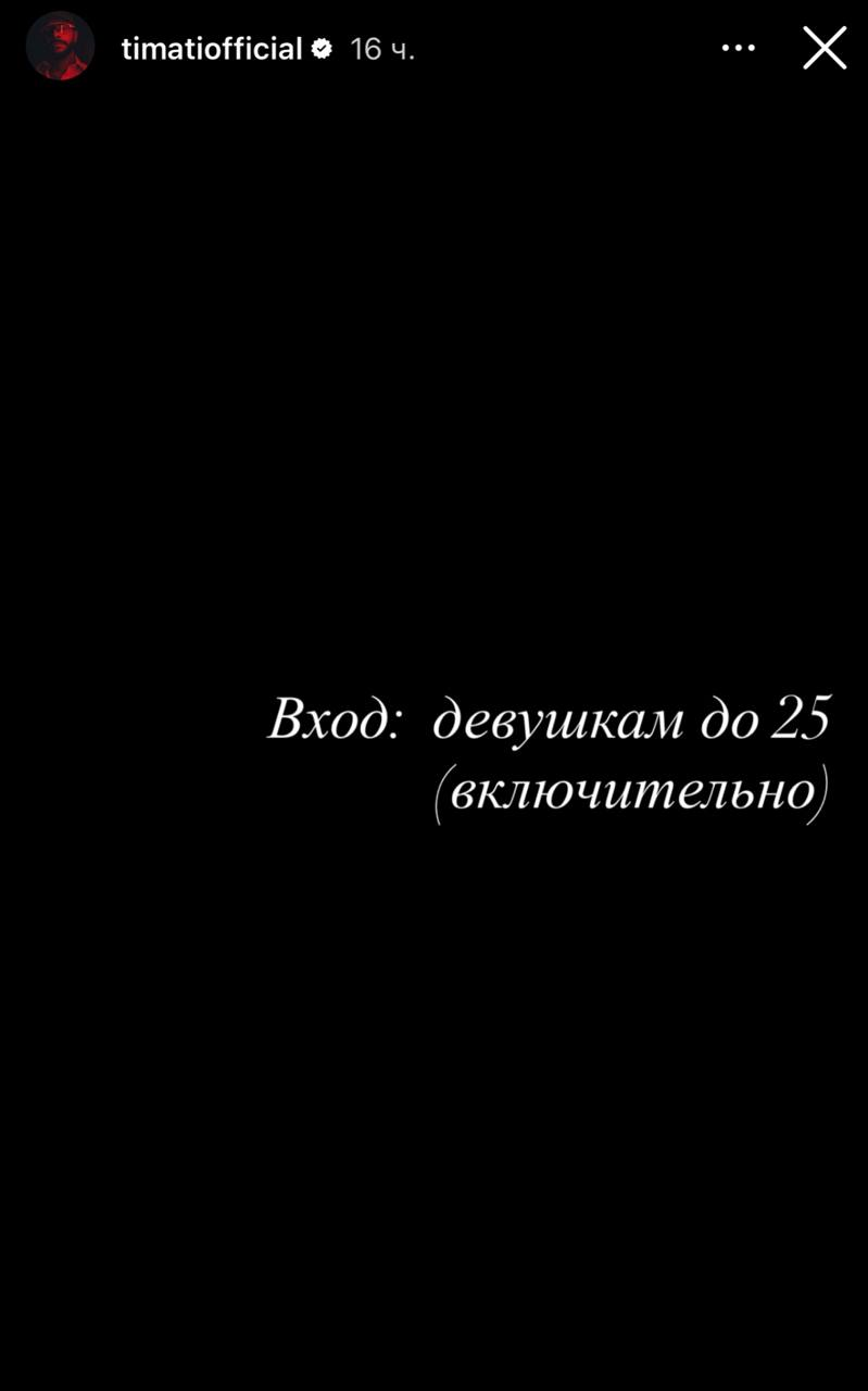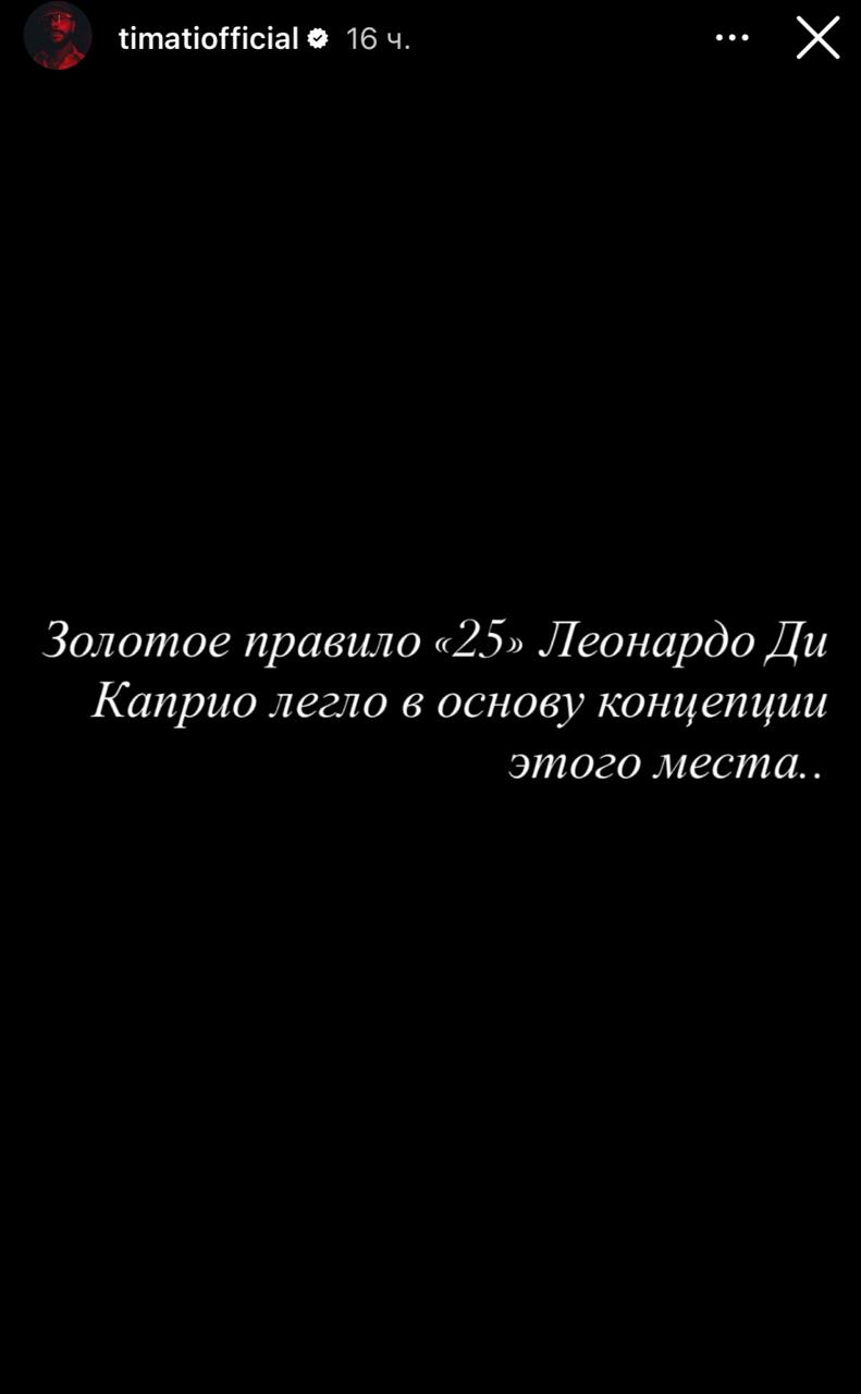 Тимати открыл новый ночной клуб в Москве, в который заложил концепцию идеи фикс у ДиКаприо "встречаться с модельками до 25". В клуб можно пройти только девушкам до 25, а мужчинам до 30 включительно)))